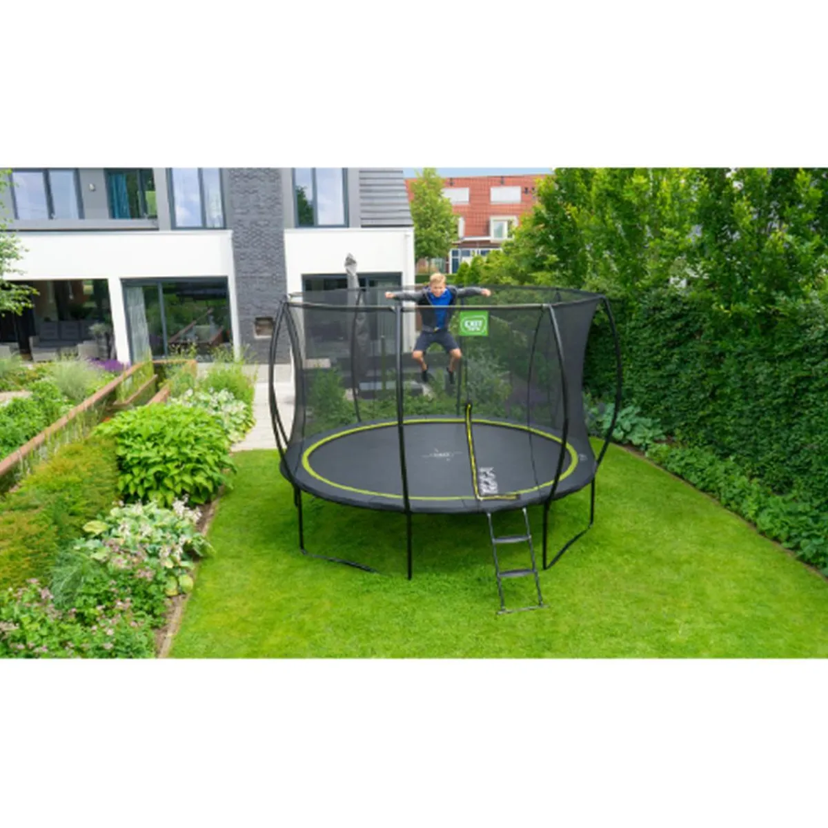 La red de seguridad es una característica estándar entregada con este trampolín. El trampolín está equipado con soportes curvos para que la red se estire firmemente. El borde protector de alta calidad cubre completamente los resortes galvanizados y está equipado con un sistema de protección de pies especialmente desarrollado que evita que su pie se atasque entre los resortes. Los robustos muelles garantizan una gran potencia de salto. El marco del trampolín Silhouette está galvanizado y recubierto de polvo para evitar la oxidación.