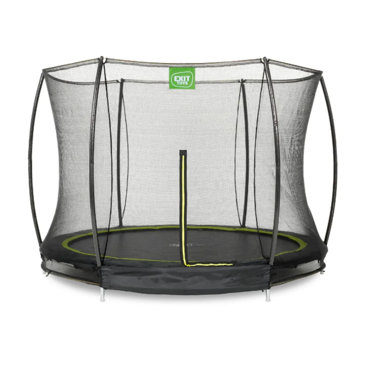 El trampolín Exit Silhouette en el suelo con red de seguridad es un trampolín redondo de buena calidad.