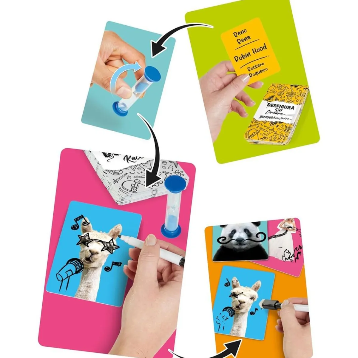 El juego incluye todo lo necesario para empezar a jugar: 50 cartas de imagen borrables, 50 cartas temáticas, un rotulador borrable, un reloj para medir el tiempo y una guía de instrucciones detallada. Así, cada partida se convierte en una aventura diferente, con infinitas posibilidades de juego.