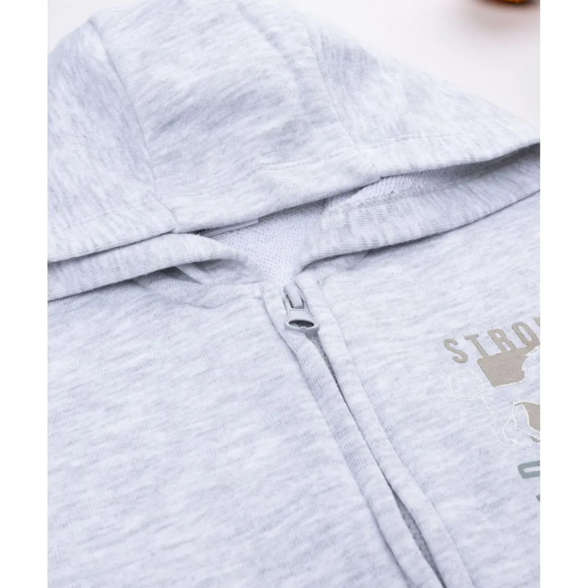 Sudadera casual afelpada tipo french terry con capucha para niño. En gris claro con pequeña ilustración de dinosaurio y bolsillos diagonales. Cierre frontal con cremallera. Ideal para looks informales.