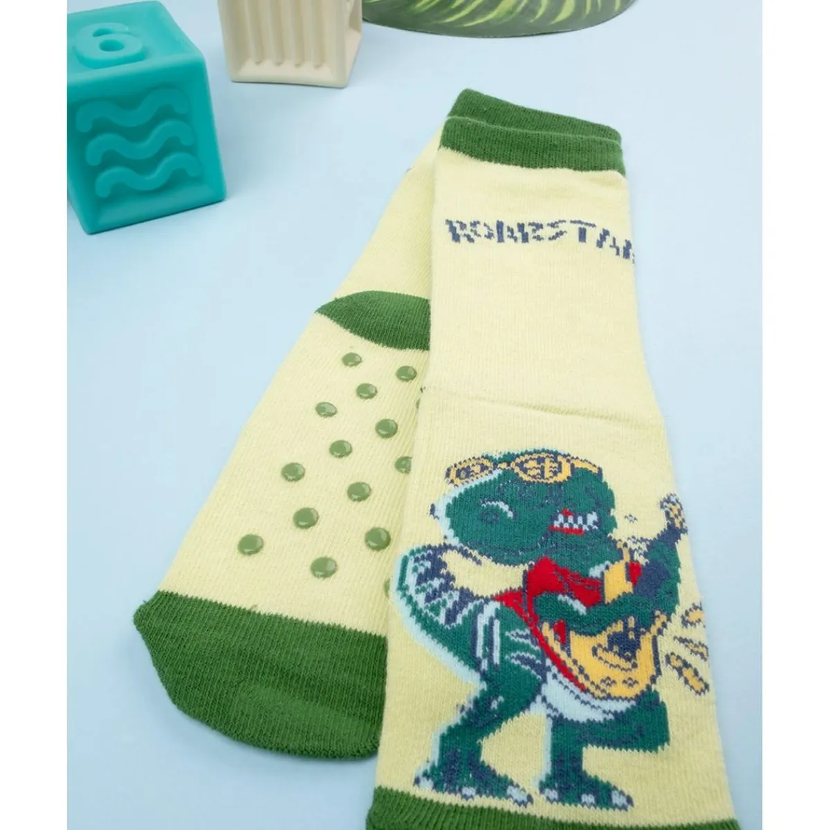 Calcetines antideslizantes de colores para niños. La prenda se desarrolla sobre una base verde con estampado Funny en color original. El ajuste es holgado y garantiza cero molestias. Los gomines garantizan estabilidad. Accesorios no a la venta. El paquete contiene solo la prenda de vestir.