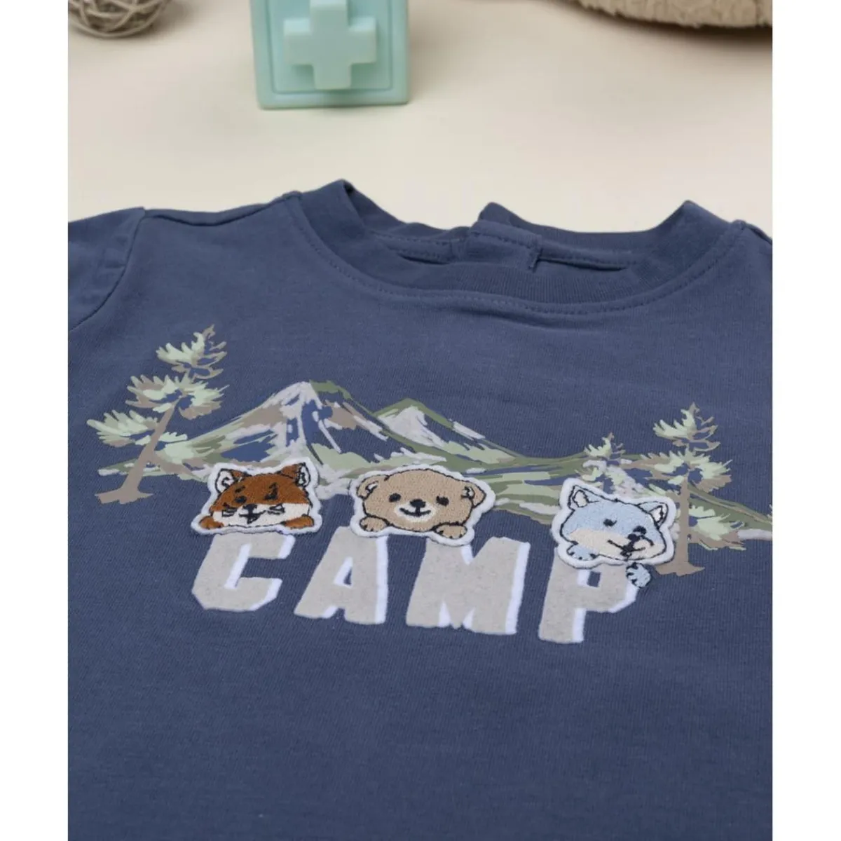 Esta camiseta infantil de manga corta en tono azul incorpora un estampado de estilo montaña en la parte frontal, evocando aventuras al aire libre. Su cuello redondo y cierre con botones a presión en la espalda garantizan facilidad de uso para los más pequeños. La prenda presenta una vestibilidad cómoda y ligera, ideal para el juego diario.
