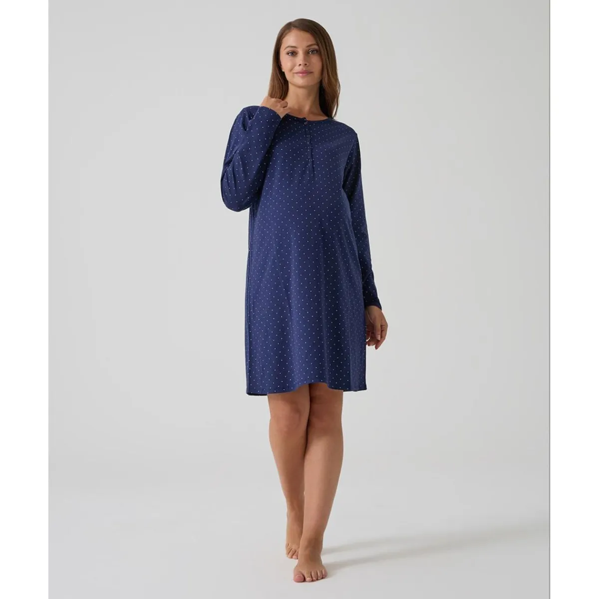 Adorable camisón para embarazo y lactancia en azul con lunares blancos. Corte cómodo y amplio, ideal para la gestación. Cierre con botones frontales para facilitar la lactancia.