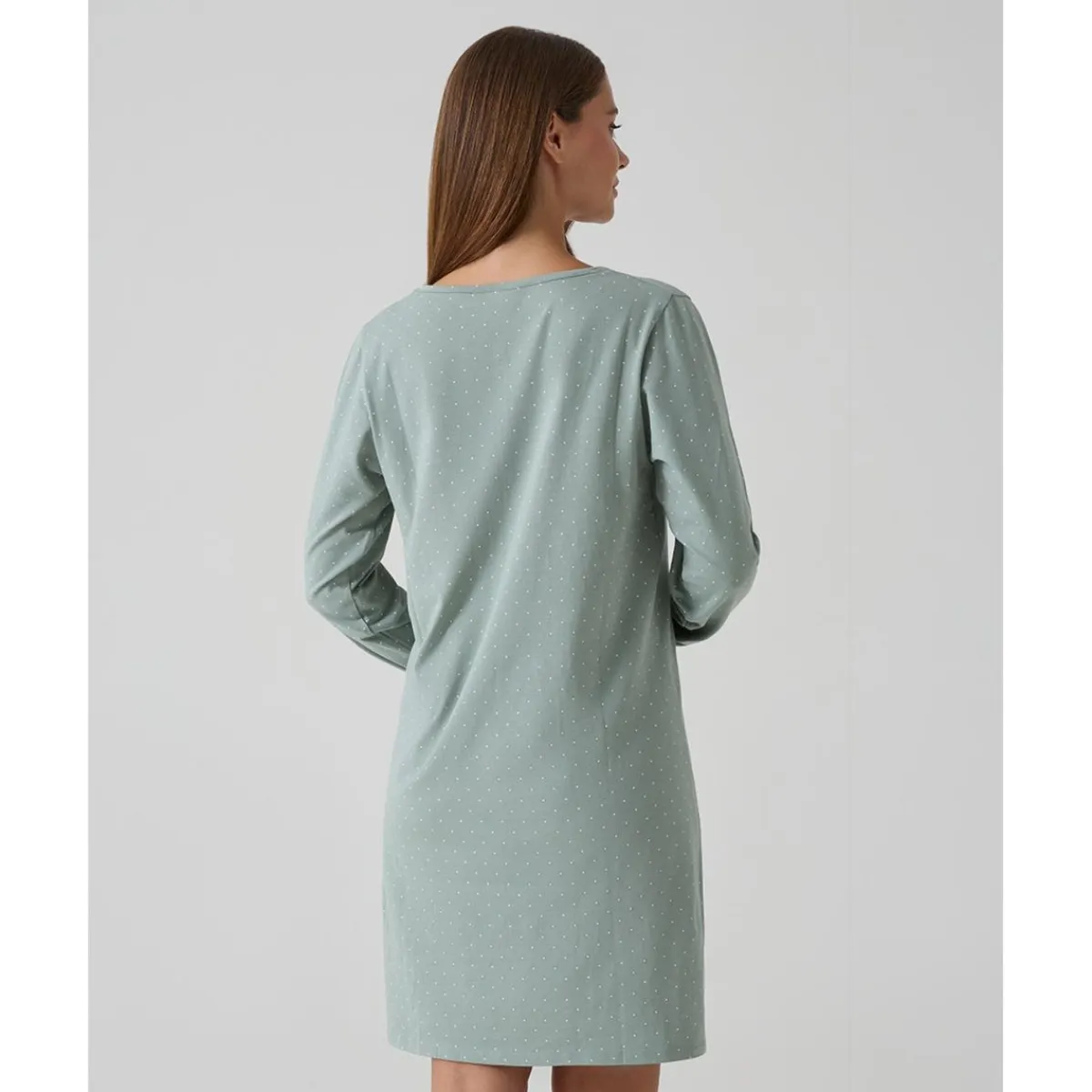 Bonito camisón para embarazo y lactancia en verde claro con estampado de lunares blancos. Corte amplio y suave que proporciona comodidad durante el embarazo. Apertura con botones en la parte delantera para facilitar la lactancia.