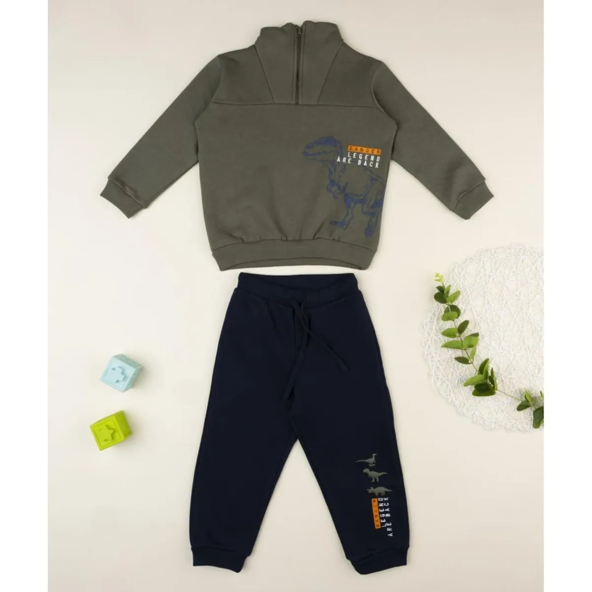 Este conjunto deportivo para niño está compuesto por una camiseta de felpa verde militar y unos pantalones largos azul marino con detalles de estampado T-rex. El cuello de la camiseta es tipo alto y tiene una cremallera frontal que permite ajustarse de forma práctica. Los pantalones son elásticos en la cintura, con cordón para mayor ajuste.