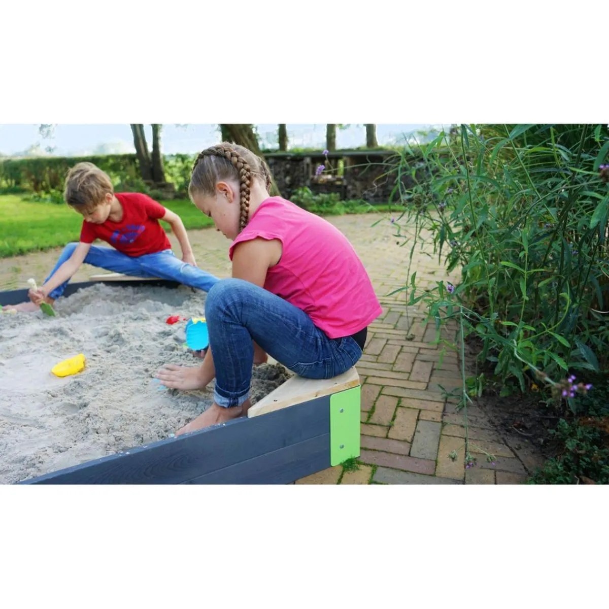 Este arenero de madera Aksent de Exit Toys es fácil de montar y súper resistente. Los orificios preperforados están asegurados con acoplamientos metálicos en las esquinas, lo que hace que el arenero sea muy estable. Las esquinas han sido pintadas de un color verde alegre y distintivo y esto, en combinación con la madera de color gris, le da al arenero un aspecto agradable y moderno.