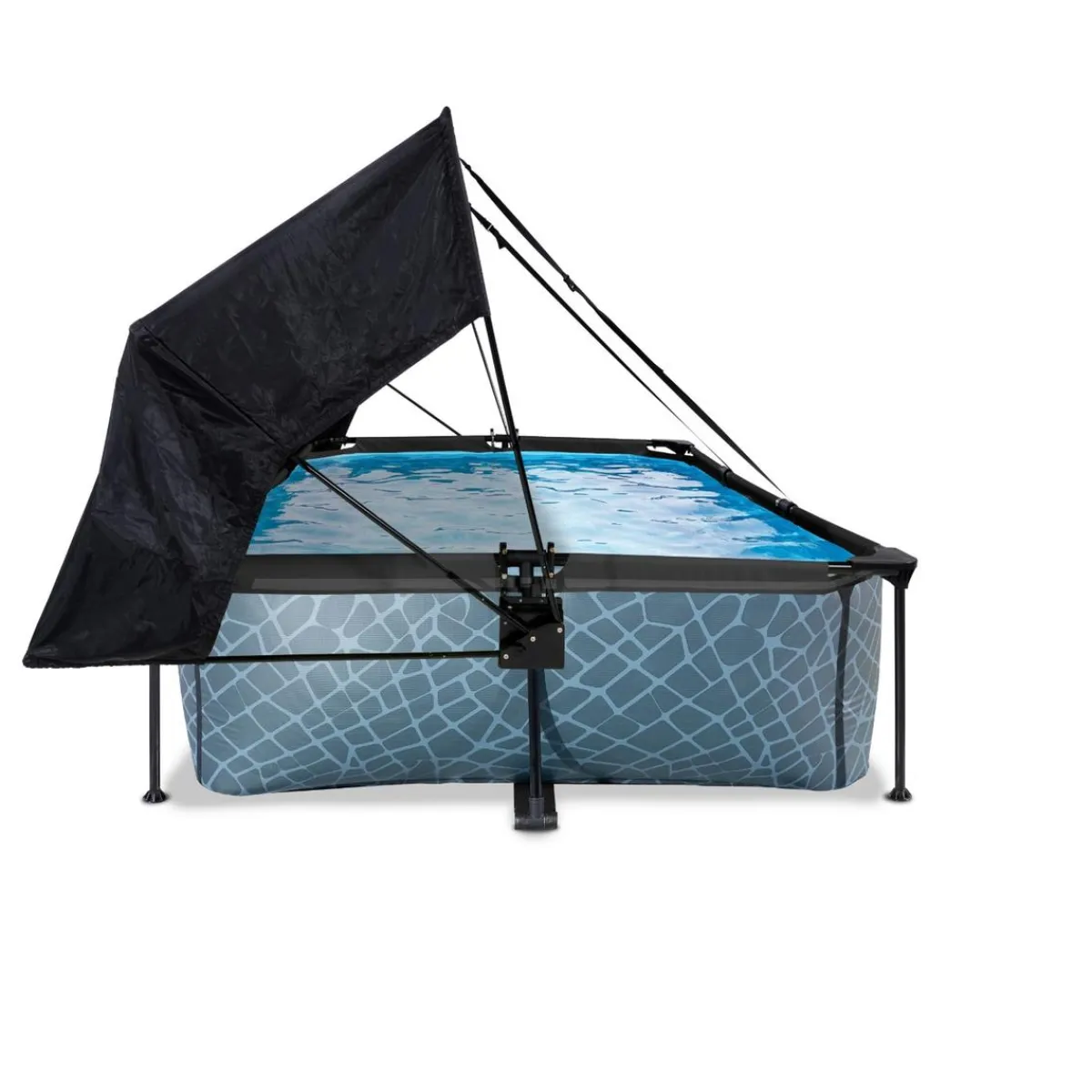 Exit – Piscina Stone efecto piedra gris 300 x 200 x 65 cm con filtro y toldo negro, una piscina rectangular de color gris con efecto de piedra que se integra perfectamente en tu jardín.