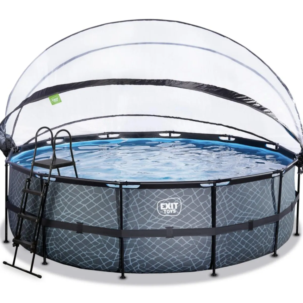 Exit – Piscina Stone gris diámetro 450 x 122 cm con filtro de arena y cúpula, una piscina redonda con efecto piedra de color gris y con cúpula.