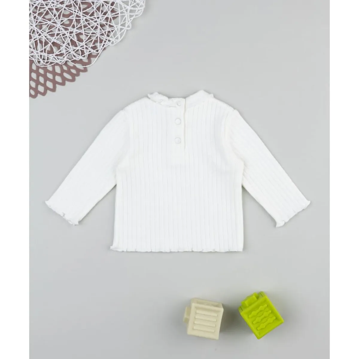 Este jersey infantil de manga larga en canalé blanco crudo es un básico cómodo y versátil. Con cuello alto y botones automáticos en la espalda, resulta práctico para vestir a diario.
