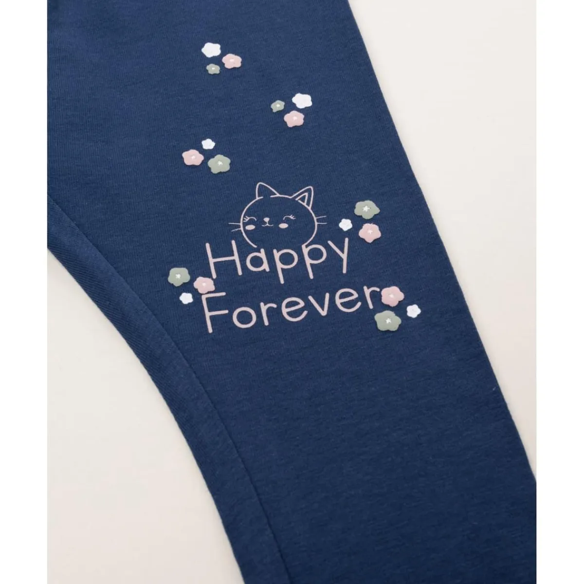 Leggings elástico de estilo casual para niña, en azul noche con estampado floral bordado a tono. Suave y cómodo, con cintura elástica. Perfecto para looks relajados y combinaciones versátiles.