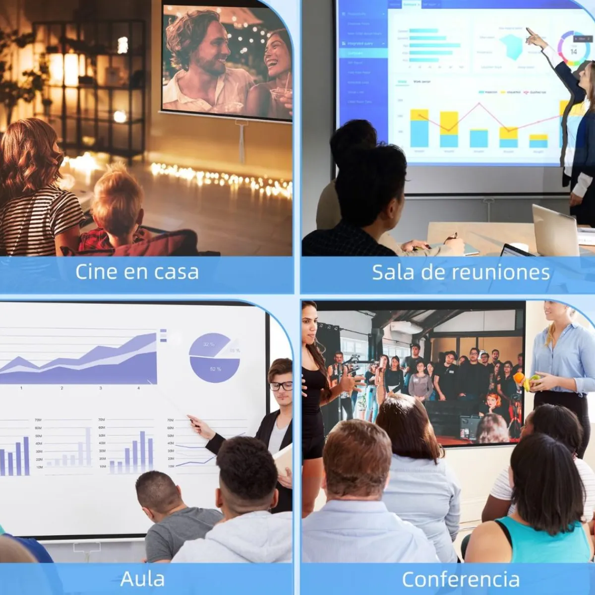 - Pantalla de proyección de 100 pulgadas con soporte, proporción 16:9 y ángulo de visión amplio de 160 grados.