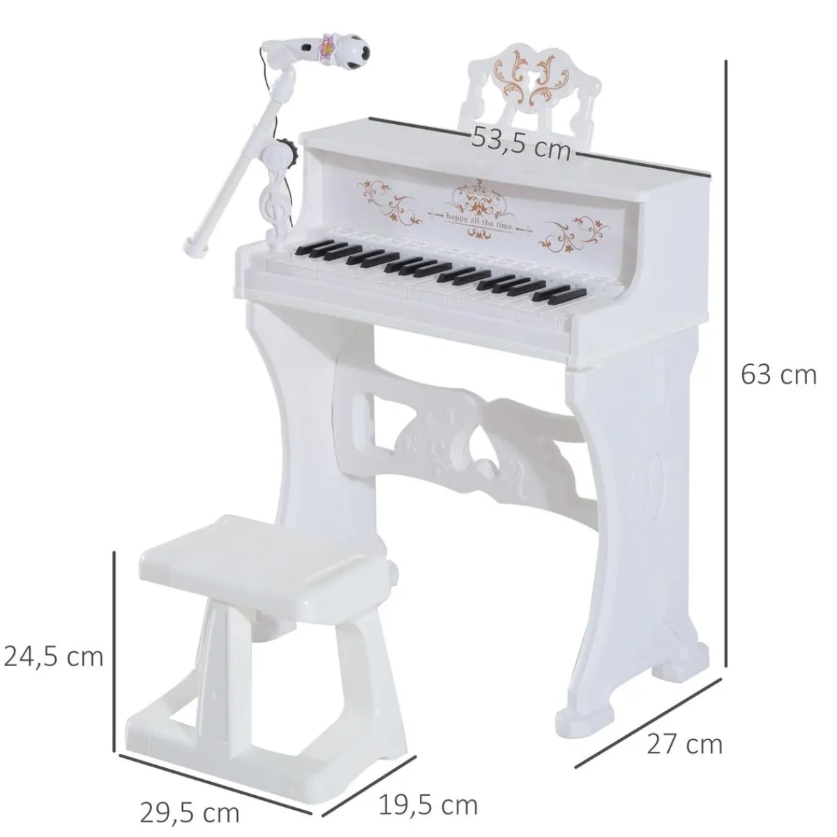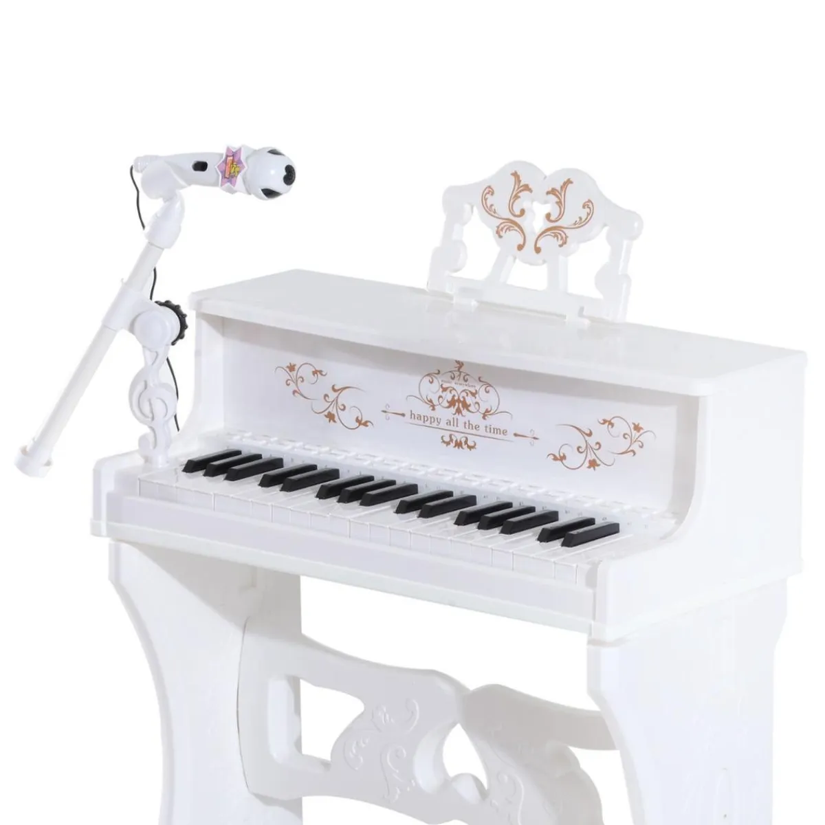 Es un piano eléctrico con 37 teclas que funciona a pilas (4 pilas AA, no incluidas). Incluye un micrófono y un taburete a juego. Para que los niños jueguen y aprendan al mismo tiempo. Es un juguete muy divertido a la vez que educativo.