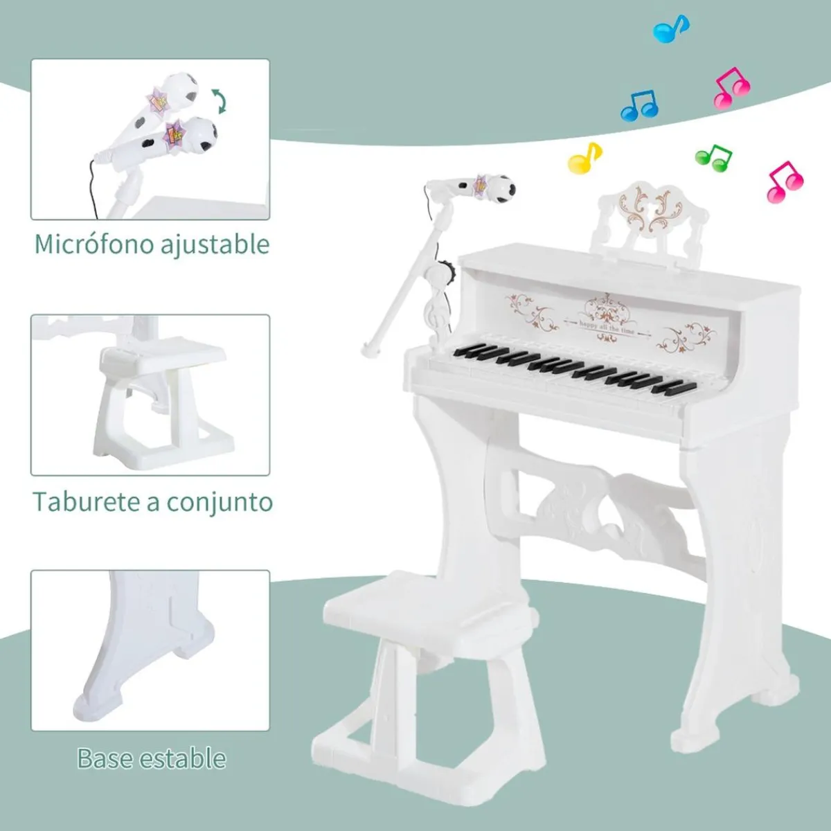 Homcom – Piano Electrónico 37 teclas con taburete Blanco. ¿Has visto qué piano infantil tan bonito? Imitando los clásicos pianos de toda la vida, este piano de Homcom de 37 teclas, viene con una banqueta a juego y un micrófono. Con canciones preinstaladas y múltiples funciones, entre ellas la de aprendizaje de canciones mediante la iluminación de las teclas ¡les encantará!