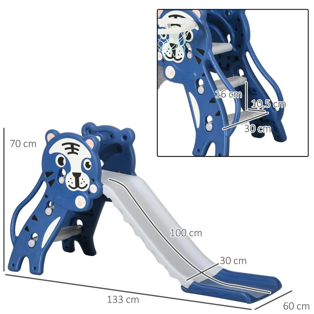 Homcom – Tobogán de interior Tigre. Diseñado para proporcionar horas de diversión, este tobogán para niños cuenta con 2 escaleras antideslizantes para garantizar a los más pequeños un apoyo seguro y una estructura confiable. El tobogán también cuenta con una canasta de baloncesto montada lateralmente para que los niños se diviertan de varias maneras con la misma estructura. Gracias a los adorables dibujos del tigre, este tobogán infantil de interior añadirá un toque juguetón a los espacios de juego de los más pequeños.