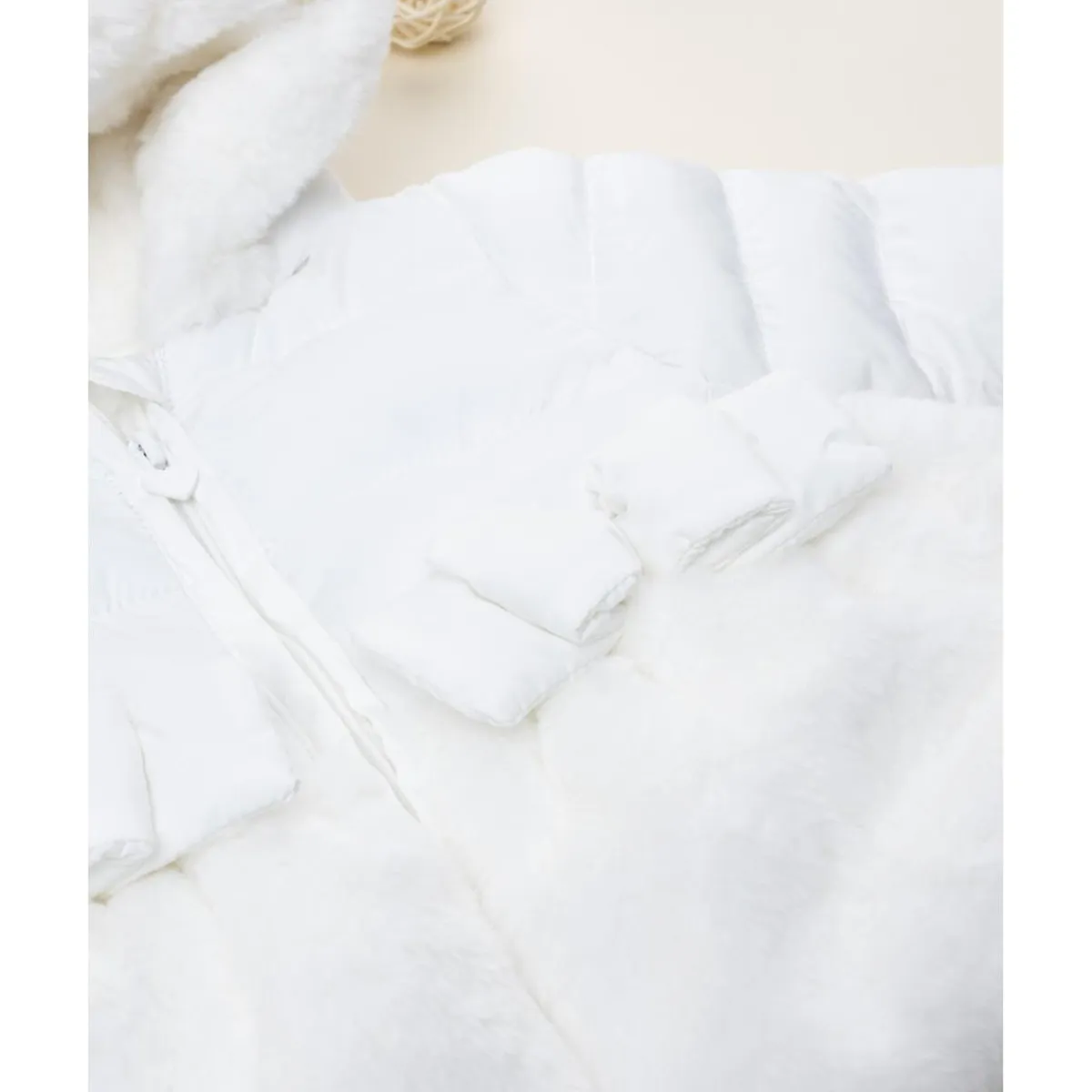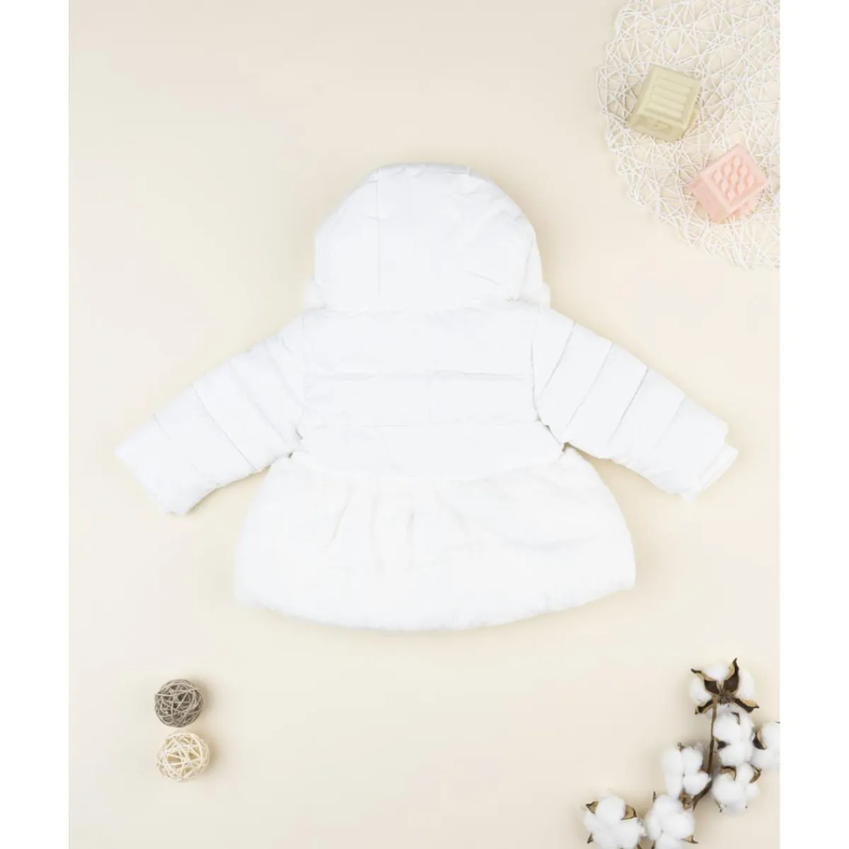 Abrigo con capucha en blanco total, decorado con lazos tono sobre tono en el frontal e inserto de peluche suave para un acabado dulce. La cremallera delantera facilita el uso diario y el ajuste cómodo permite llevar capas por debajo sin perder libertad de movimiento.