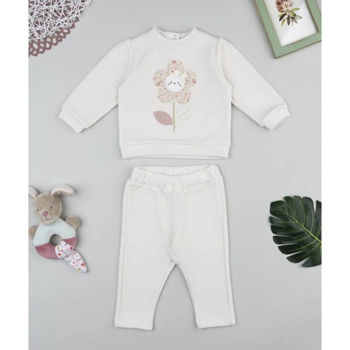 Este conjunto infantil de dos piezas incluye una sudadera en color blanco crudo con estampado de margarita en el frente y pantalón a juego en el mismo tono. La camiseta cuenta con cierre de automáticos en la espalda para mayor practicidad, mientras que el pantalón incorpora cintura elástica para un ajuste cómodo.