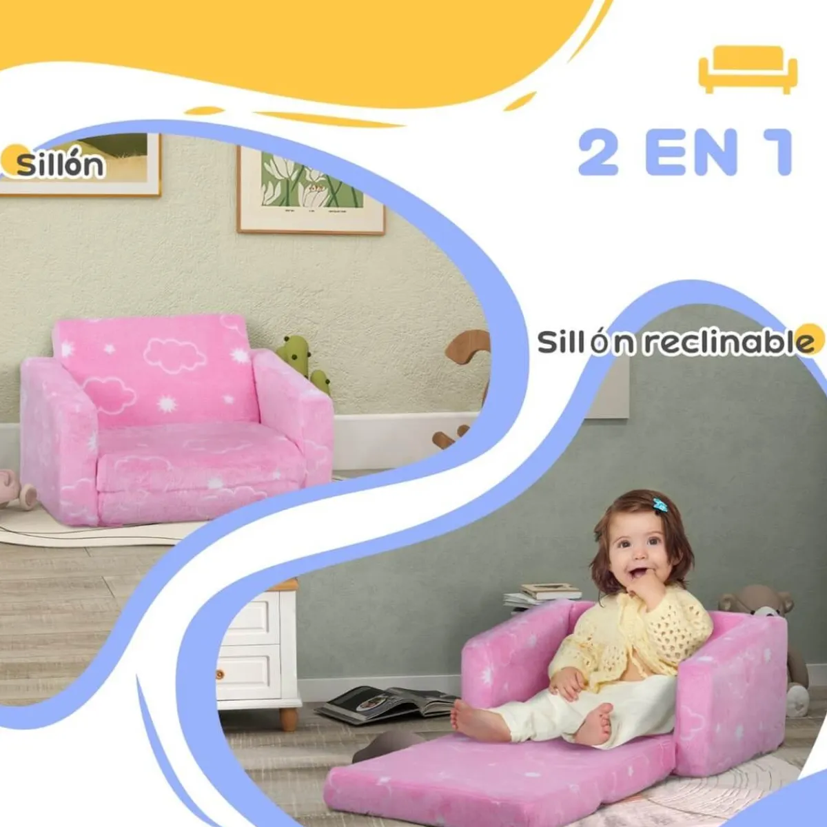 Homcom – Sillón infantil Rosa brilla en la oscuridad. Este increíble sofá infantil, con tela luminosa, encantará a los niños al transformar su habitación en un espacio mágico por la noche. Su diseño 2 en 1 permite ajustarlo fácilmente de una posición de sentado a una de descanso, ideal para siestas o momentos de relax. Hecho de espuma suave, con un respaldo amplio y reposabrazos, este sillón proporciona un excelente confort para los pequeños.