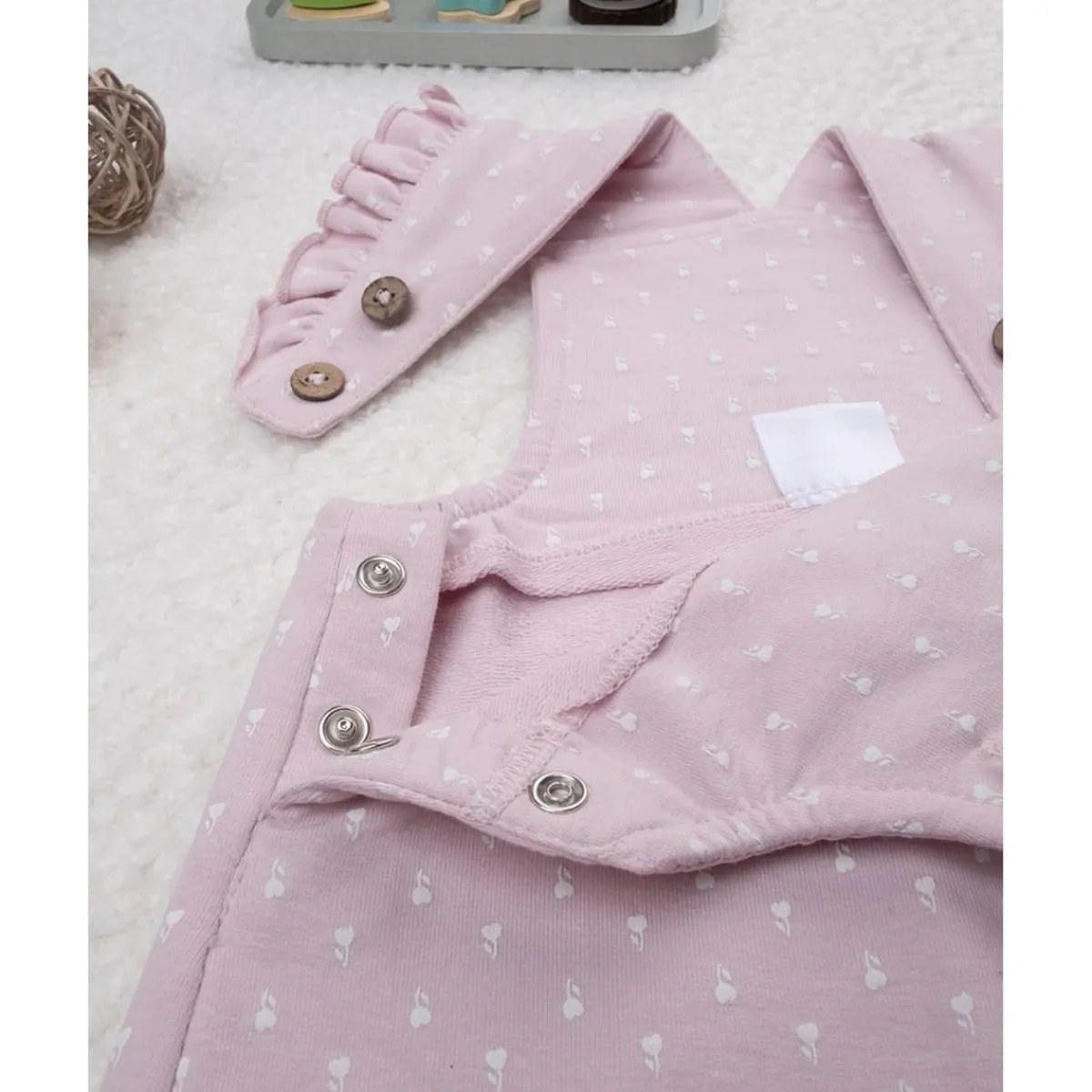 Peto tierno para niña en rosa claro con estampado allover tono sobre tono. Ajuste práctico con tirantes y botones, además de botones automáticos en la entrepierna. Confección en algodón Oeko-Tex, seguro y cómodo.