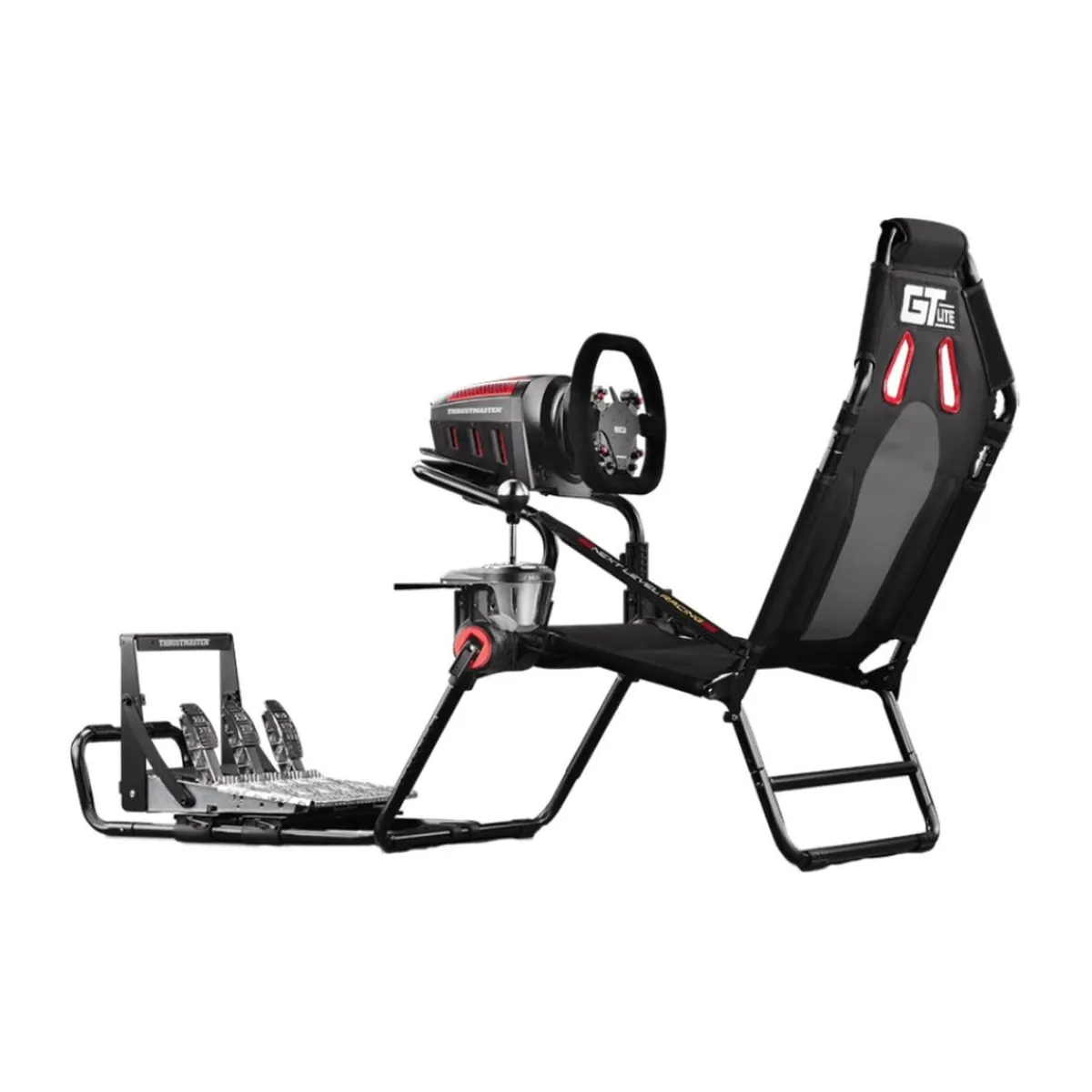 El diseño único del cockpit plegable GT lite permite que se pueda plegar para guardar incluso con los dispositivos electrónicos instalados, permitiéndole al usuario almacenar su cabina de mando cuando no esté en uso y haciendo de ella la cabina de mando perfecta para competidores de simuladores con espacio limitado. Esto también permite que el simulador de carreras GT lite sea plegable y portable y que el piloto pueda llevar su cockpit de competición de una habitación a otra cuando lo necesite.