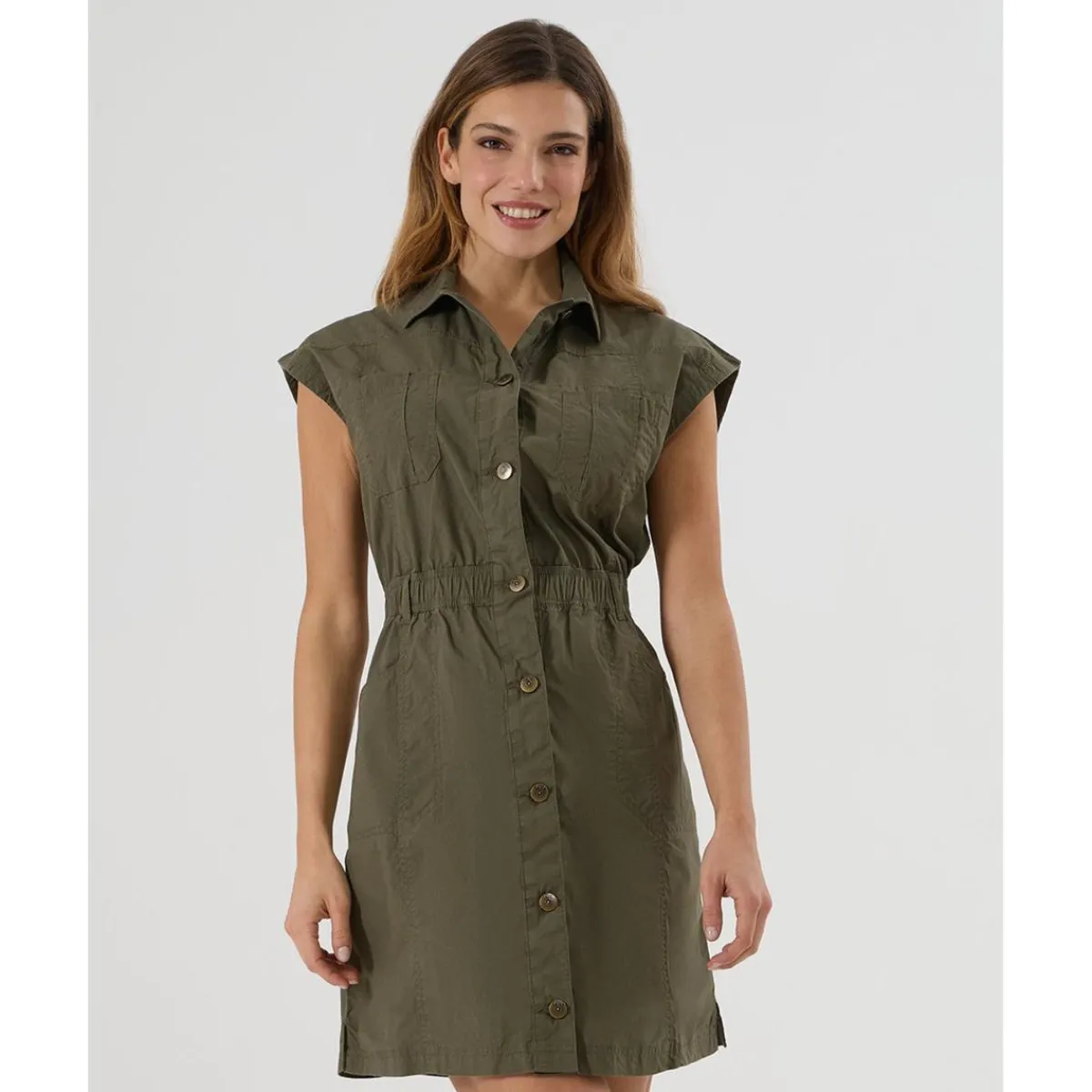 Este vestido camisero en verde militar es una opción ideal para mamás durante y después del embarazo. Gracias a su cierre delantero con botones metálicos, facilita la lactancia de manera práctica. Con cuello camisero, sin mangas y corte fluido, incorpora elástico en la cintura y múltiples bolsillos delanteros y traseros. Un look cómodo y con estilo para cualquier momento del día.