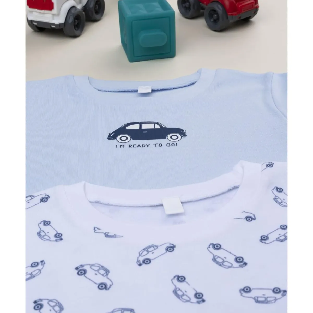 Este pack de 2 camisetas interiores de manga corta está diseñado para la comodidad diaria de los más pequeños. Incluye un modelo en blanco y otro en azul claro, ambos con estampados de coches divertidos. El algodón certificado Oeko-Tex garantiza suavidad y seguridad.