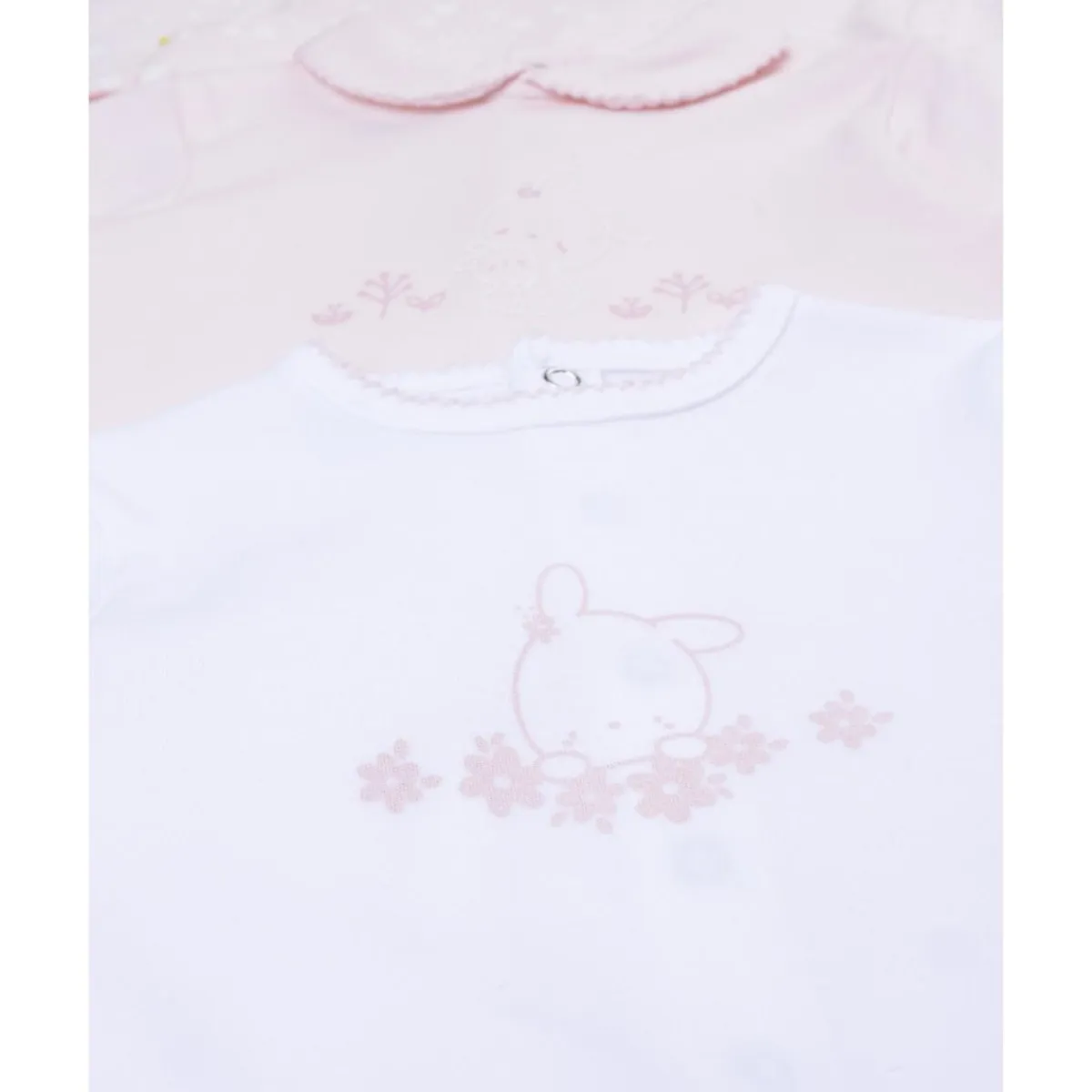Este pack incluye tres peleles largos con pies, diseñados en algodón interlock para ofrecer la máxima suavidad. Uno en blanco con estampado de conejito, otro en rosa con patrón allover y el tercero en rosa con estampado frontal, cada uno con detalles delicados que aportan encanto al conjunto.
