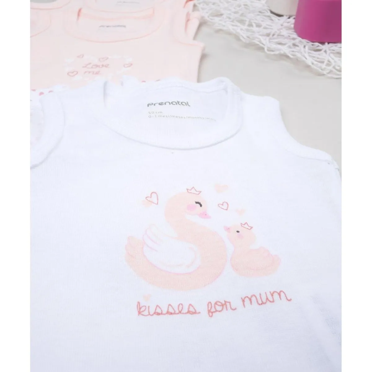 Pack de 5 bodies sin mangas para niña. Incluye 2 bodies rosa claro, dos estampados y uno blanco con detalle estampado. Modelo con cuello redondo. Apertura en la entrepierna con prácticos botones a presión. Accesorios no a la venta. El paquete contiene solo la prenda de vestir.