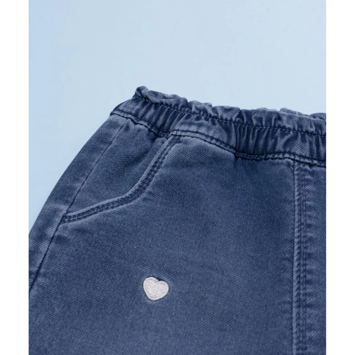 Tierno pantalón para niña en denim azul claro con estampado allover de corazones. Cintura elástica para un ajuste suave y cómodo. Ideal para looks encantadores y versátiles.