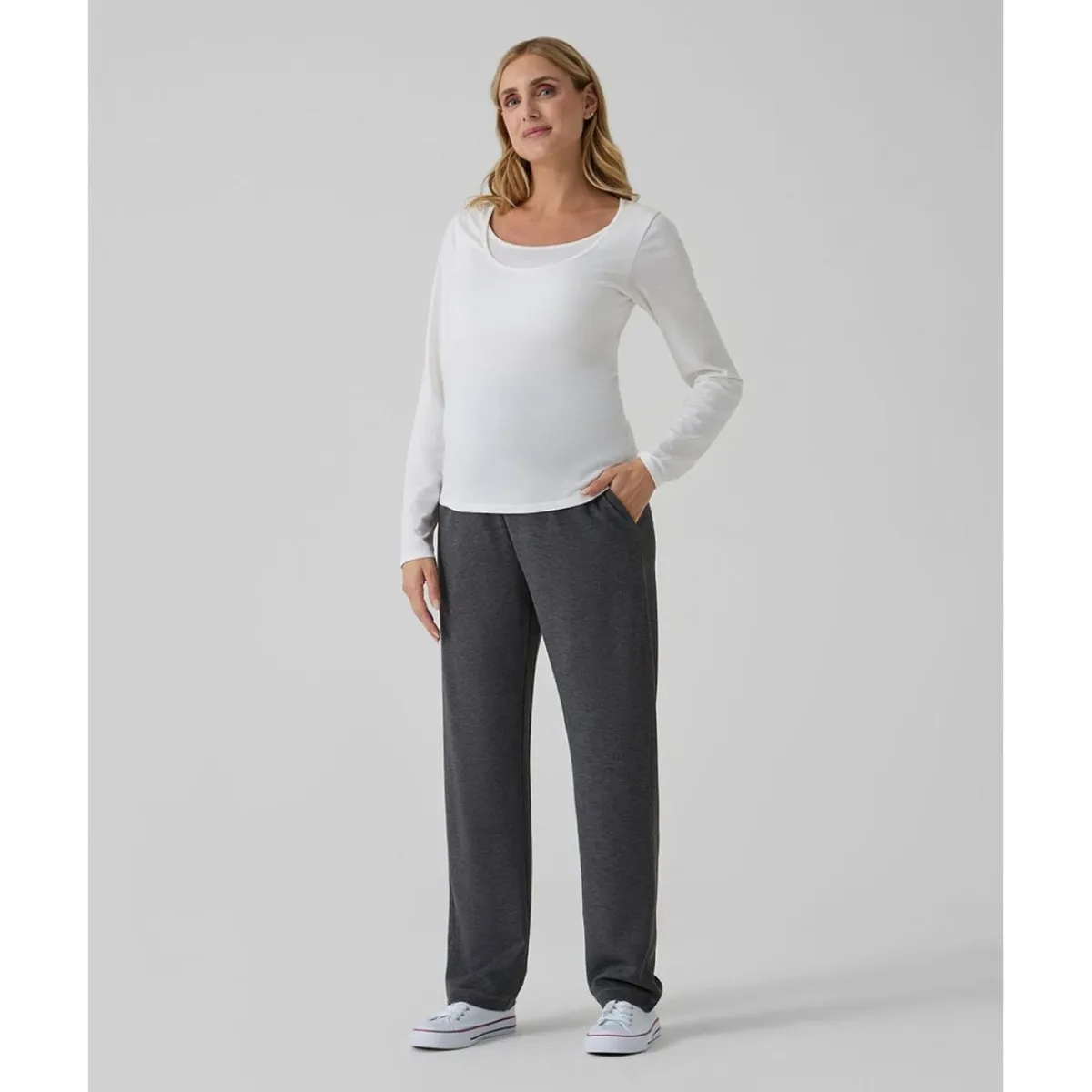El pantalón premamá en felpa modal ofrece un ajuste amplio y suave que acompaña cada trimestre. Integra una faja alta elástica en jersey con goma interior para sostener el vientre sin presionar, y cuenta con dos bolsillos laterales para lo esencial. La cintura es regulable, de modo que se adapta a la evolución de la silueta. Su caída fluida y el tacto agradable lo convierten en un imprescindible para casa, consultas o paseos.