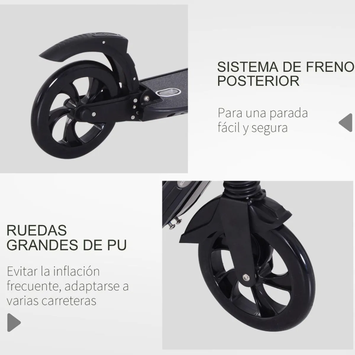 Homcom – Patinete Scooter Ajustable 2 ruedas Grande Negro. El patinete ya no es solo un juguete para niños; en los últimos años se ha convertido en el compañero perfecto para traslados cortos. Y este patinete plegable de Homcom, adecuado también para mayores de 14 años, te ofrece toda la comodidad para disfrutar en tu tiempo libre y para utilizar en los traslados cortos de tu día a día. Además, es una forma muy divertida de hacer ejercicio. ¿A qué esperas? ¡Empieza a ahorrar tiempo y dinero en transporte público con este fantástico patinete plegable!