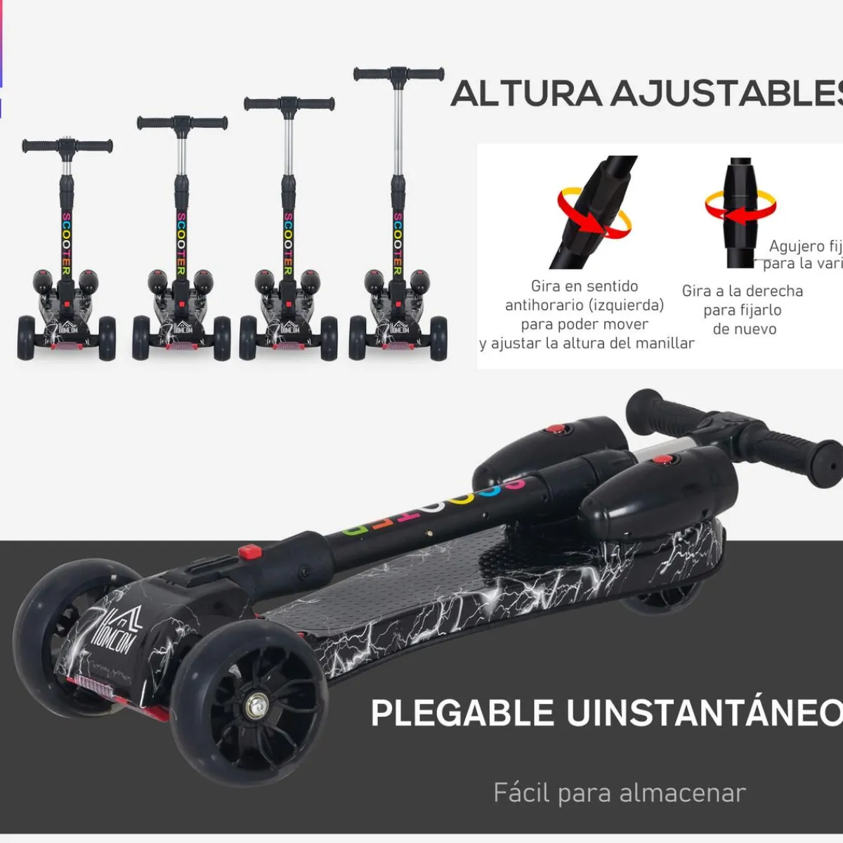 Homcom – Patinete scooter con efectos de luz y sonido. Si buscas un patinete funcional y a la vez moderno, este scooter es sin duda el producto que estás buscando.