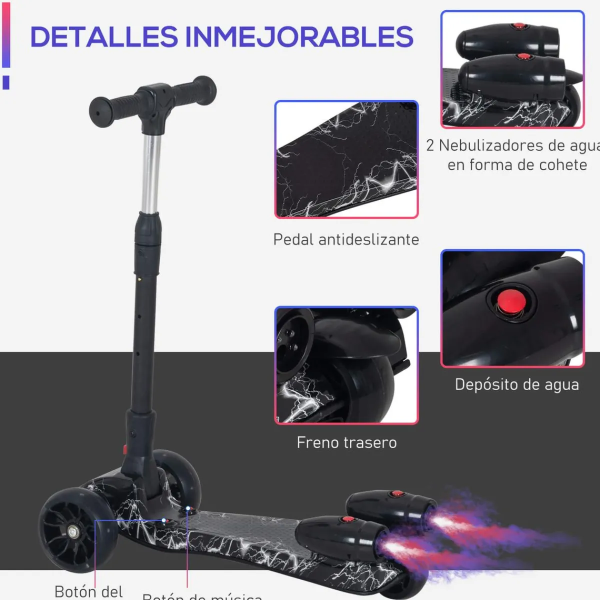 Este scooter es ideal para niños, con ruedas que hacen luz al rodar, música y 2 lanzadores de niebla de agua en forma de cohete en la parte posterior. Cuando tus hijos jueguen con él, sin duda atraerán la atención de los demás. Tus hijos estarán encantados con este scooter tan genial.