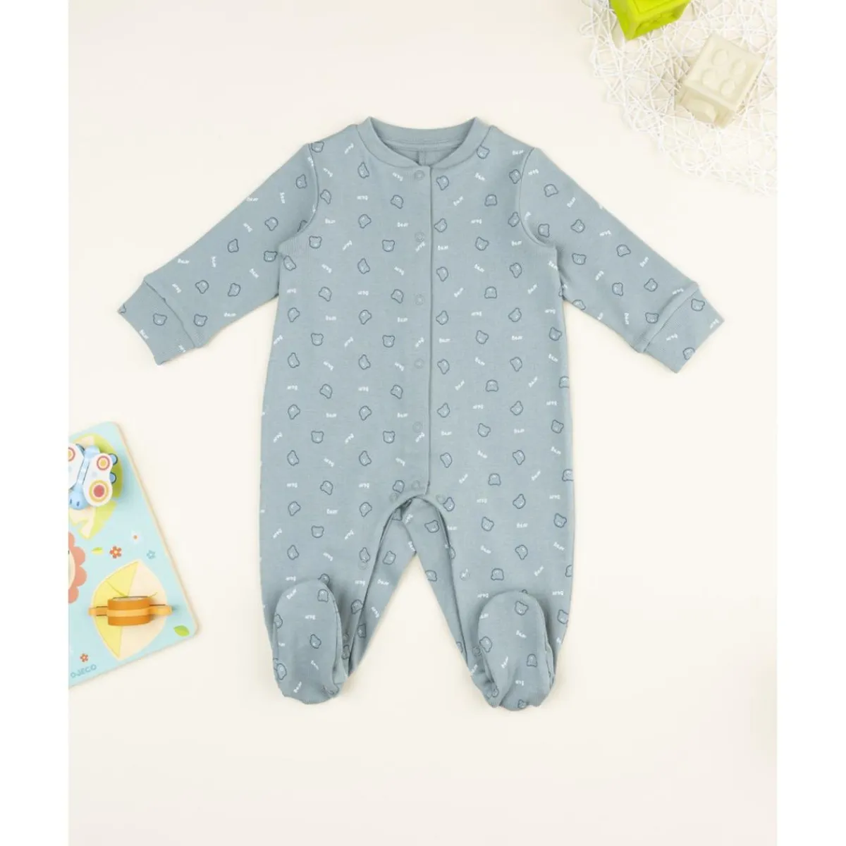 Tierno pelele para niño. Prenda de una sola pieza con pies, en color verde intenso con estampado allover en tono coordinado. Ajuste suave y práctico gracias a botones automáticos al frente y entrepierna. Algodón Oeko-Tex, seguro para la piel. Accesorios no incluidos. La caja contiene solo la prenda de ropa.