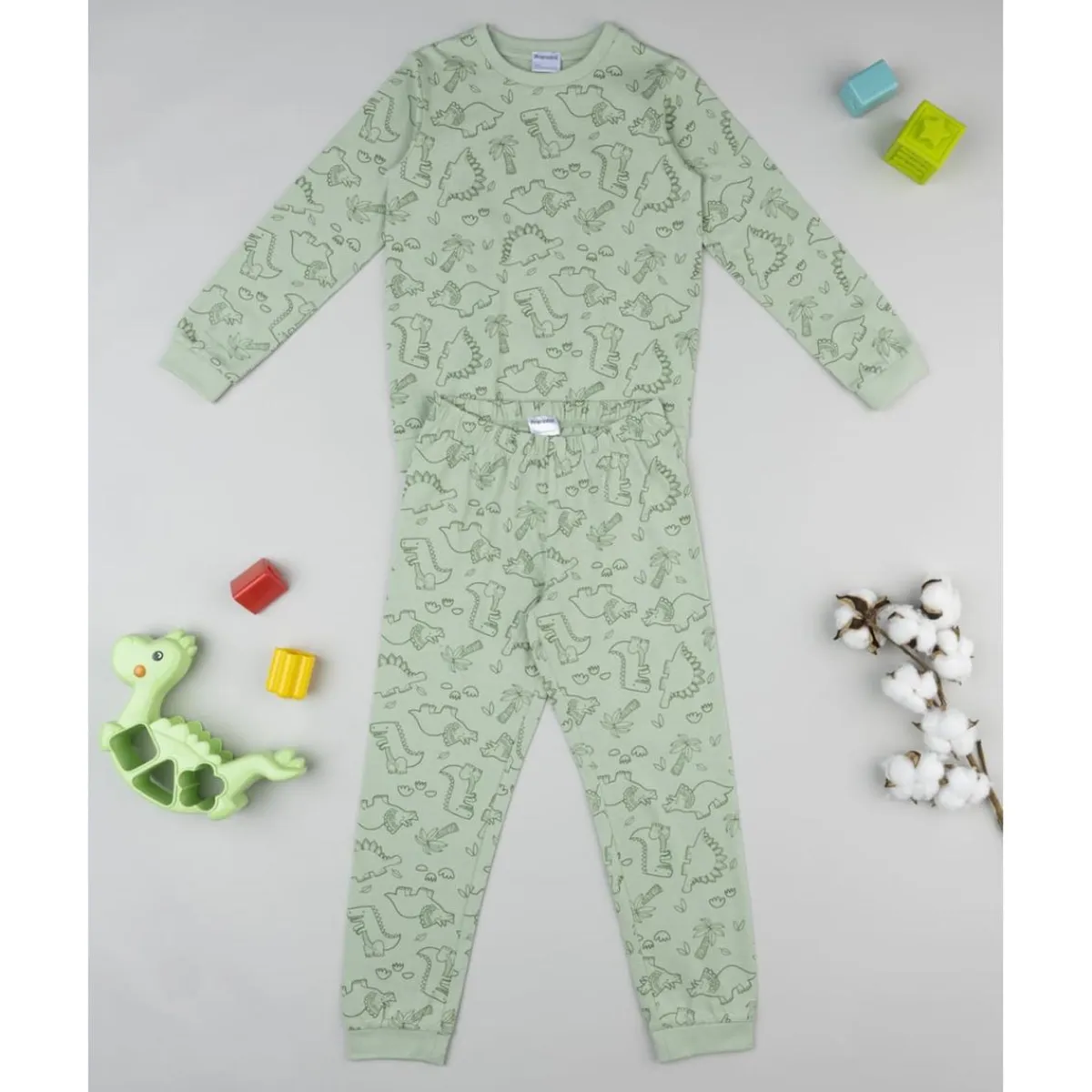 Este pijama de dos piezas para niño tiene un diseño divertido y cómodo. La camiseta de manga larga es de color verde y presenta un estampado de dinosaurios en todo su cuerpo. Los pantalones, a juego con la camiseta, tienen una cintura elástica para un ajuste perfecto y cómodo. Ideal para los días de descanso o para dormir, es una prenda versátil y cómoda para el día a día.