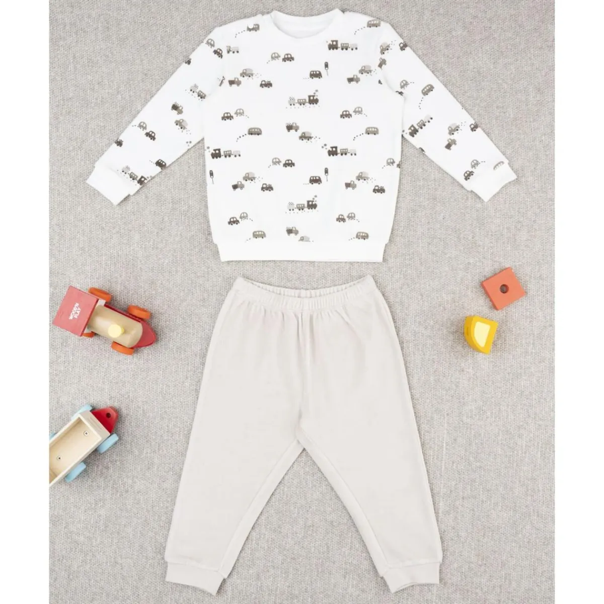 Pijama casual de dos piezas para niño en beige con estampado allover de autos en la camiseta y pantalón con cintura elástica ajustable. Su tejido de ciniglia proporciona suavidad y comodidad durante la noche.