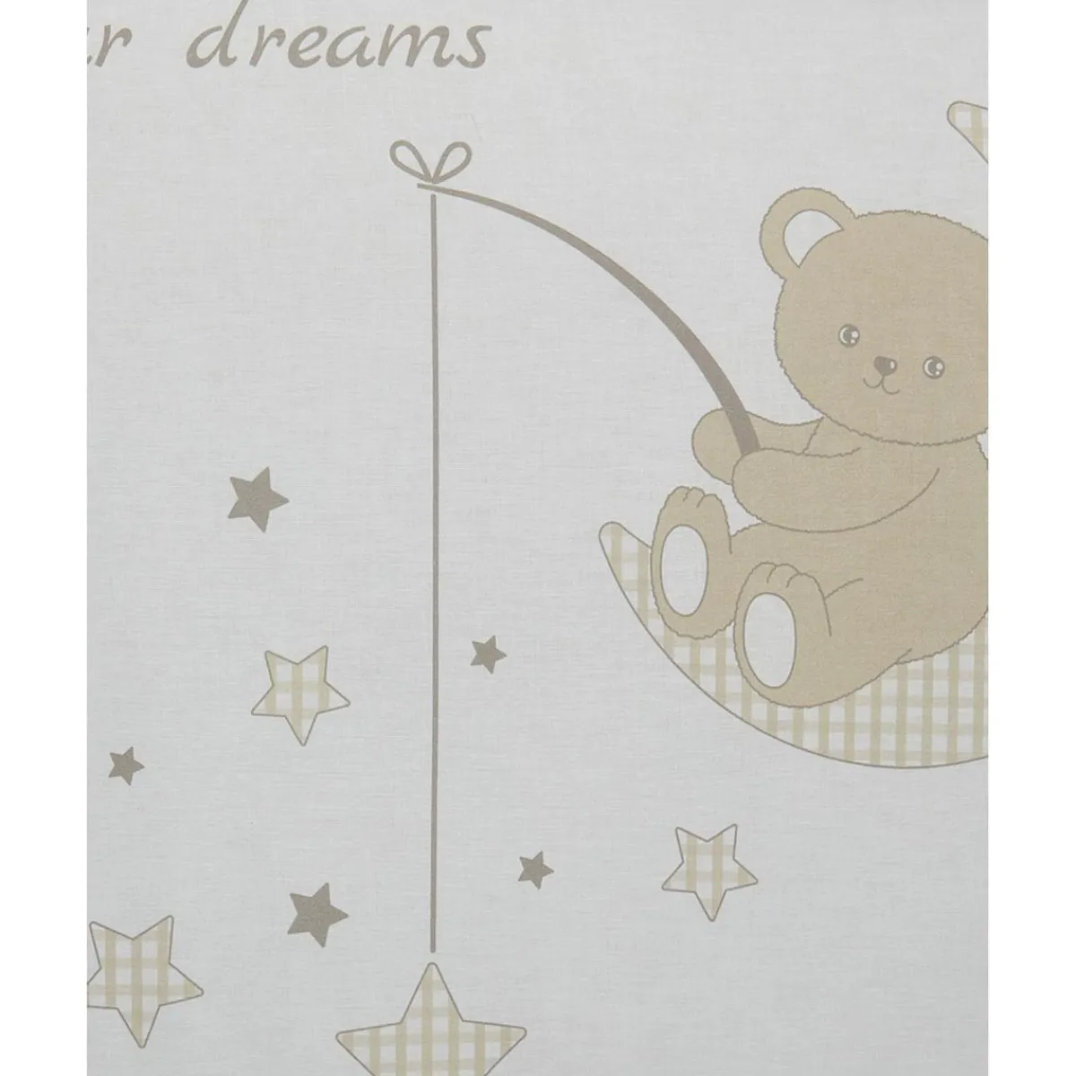 Este encantador protector de cuna está elaborado en tejido blanco con detalles en beige, brindando un aspecto cálido y acogedor al entorno de descanso de tu bebé. El accesorio está adornado con la imagen de un dulce osito sentado en la luna, pescando estrellas. Cuenta con lazos para una sujeción segura y estable. Sus dimensiones de 195×40 cm lo hacen adecuado para la mayoría de las cunas estándar, proporcionando protección y estilo.
