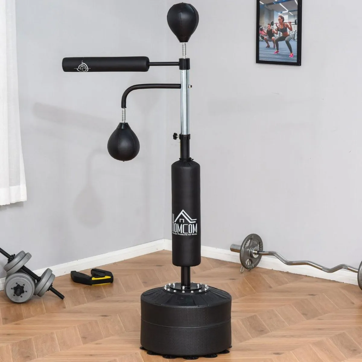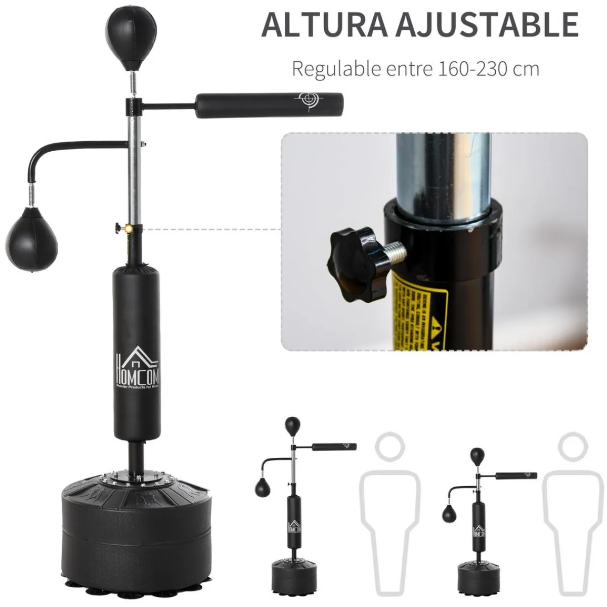 Homcom – Saco de boxeo de pie, Este saco de boxeo de pie para adulto cuenta con una parte principal compuesta por el poste principal con el saco de boxeo de pie de PU, para una buena sensación de ataque, un brazo flexible y dos peras de boxeo. Ideal para mejorar de forma integral tu nivel y habilidades, trabajando los reflejos, coordinación y precisión.