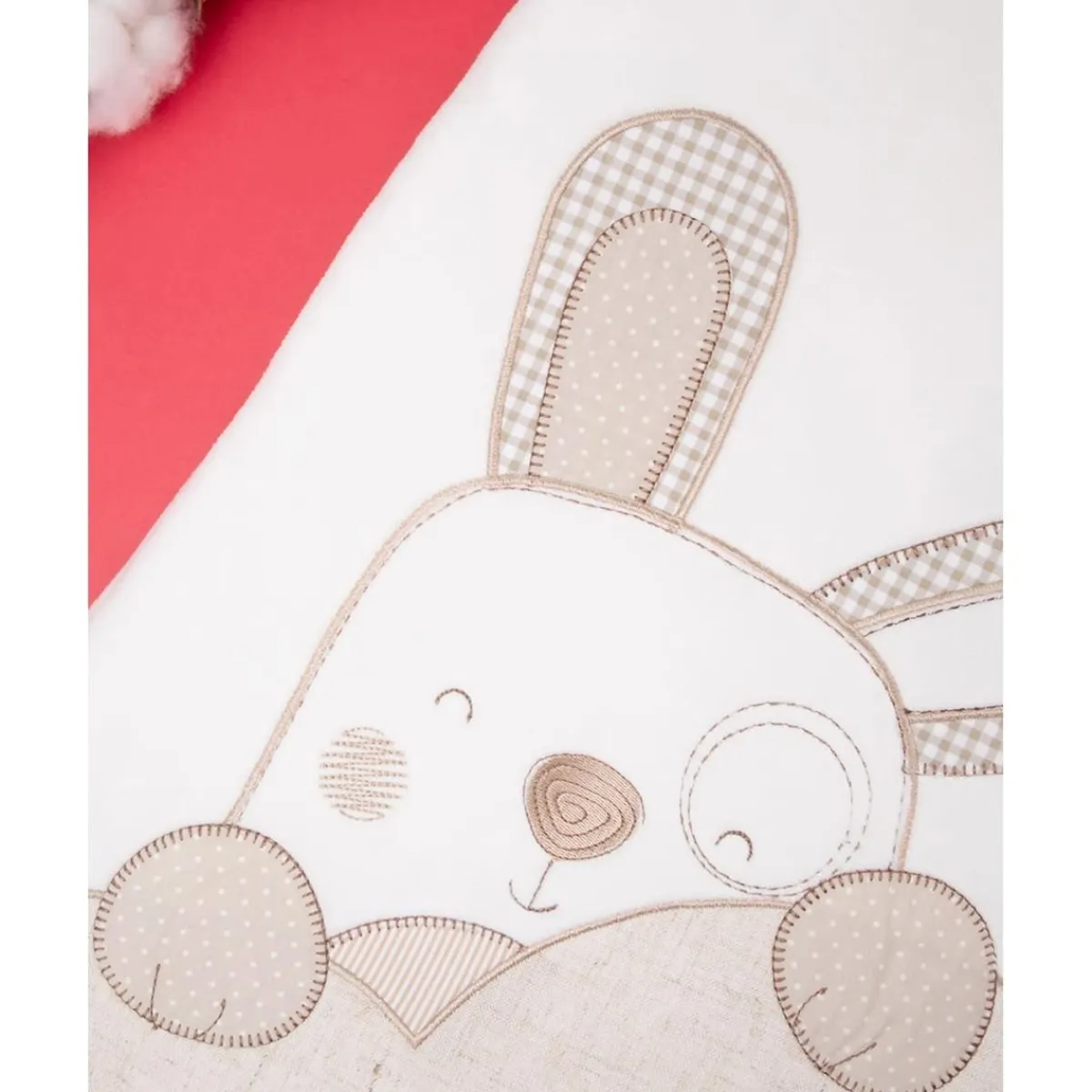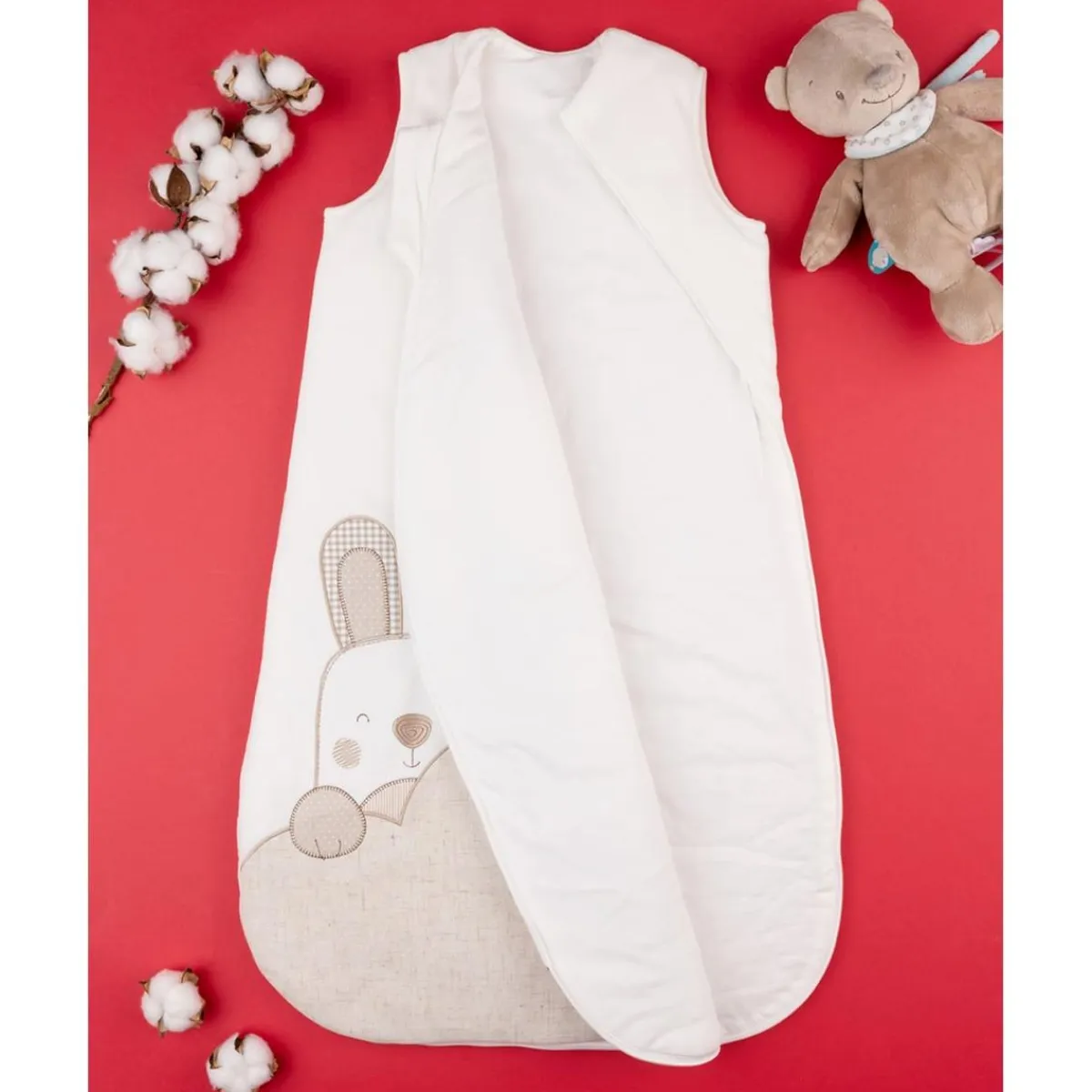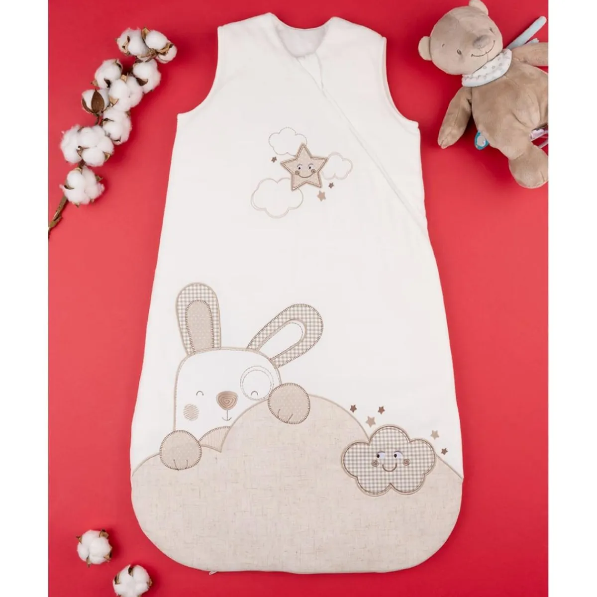Encantador saco de dormir blanco en felpa con decorado de un tierno conejito en beige. Cierre con cremallera frontal. Proporciona abrigo y comodidad durante toda la noche.