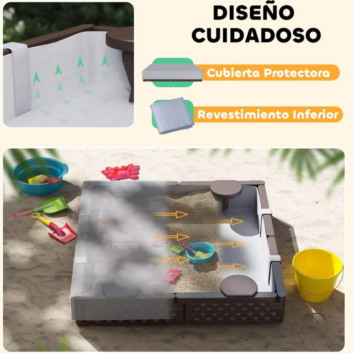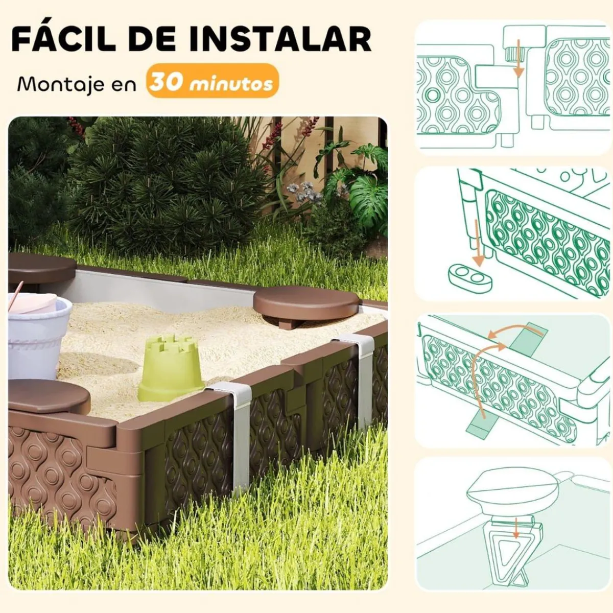 Este arenero es ideal para jardines, patios o terrazas, proporcionando un espacio seguro y divertido para que los niños jueguen y socialicen. Su diseño resistente y materiales de alta calidad garantizan durabilidad y seguridad en cada uso.