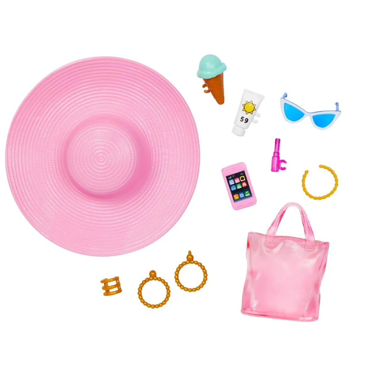 El Barbie Día de playa cuenta con accesorios adicionales increíbles que aumentan la diversión, incluyendo su bolso rosa perfecto para llevar su protección solar, barra de labios y smartphone. Además, su cono de helado de menta puede engancharse a su mano para un toque realista