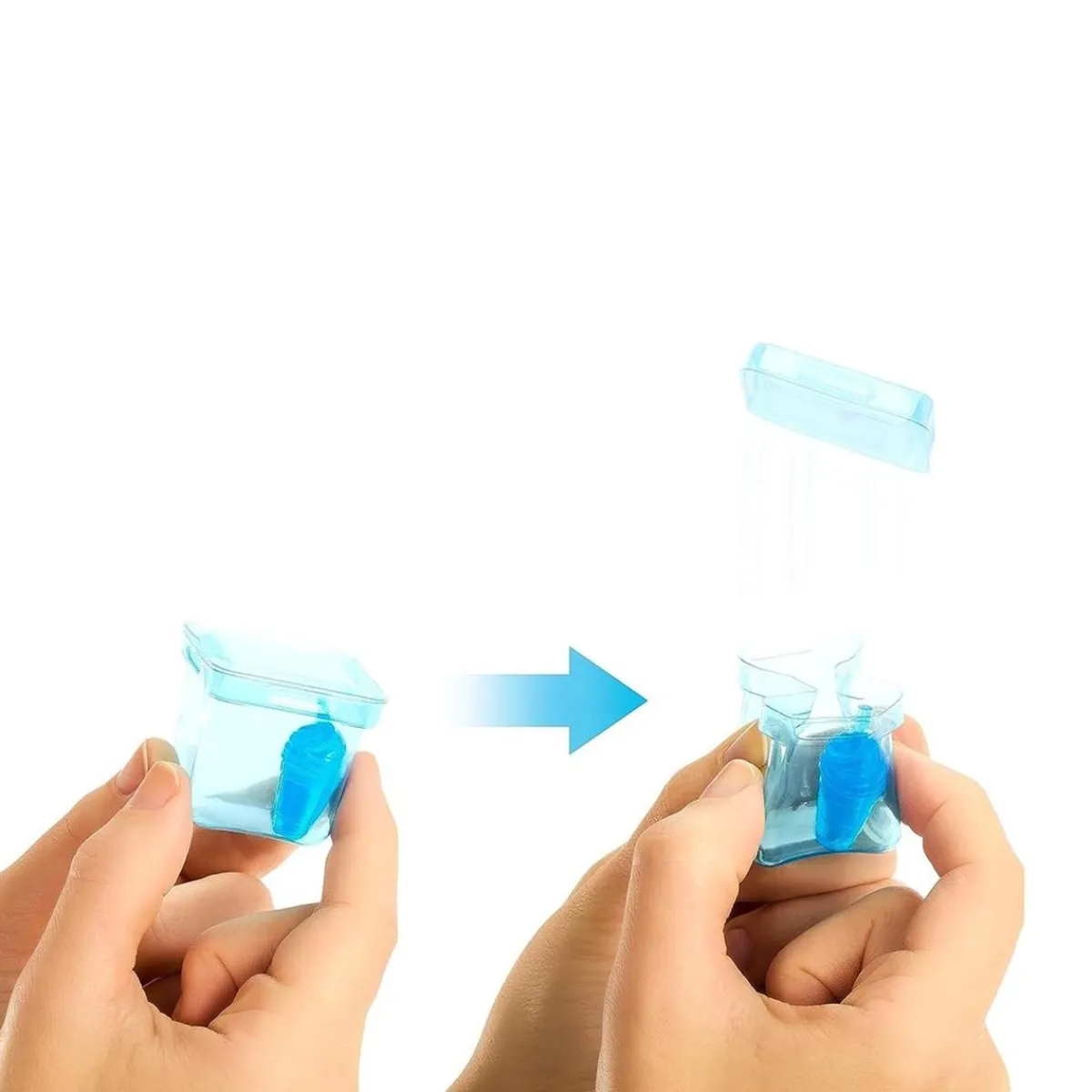 Después, vuelve a enroscar la tapa y usa la pajita para romper la parte superior y liberar el Slime azul. ¡Mira cómo cubre los cubitos de hielo!