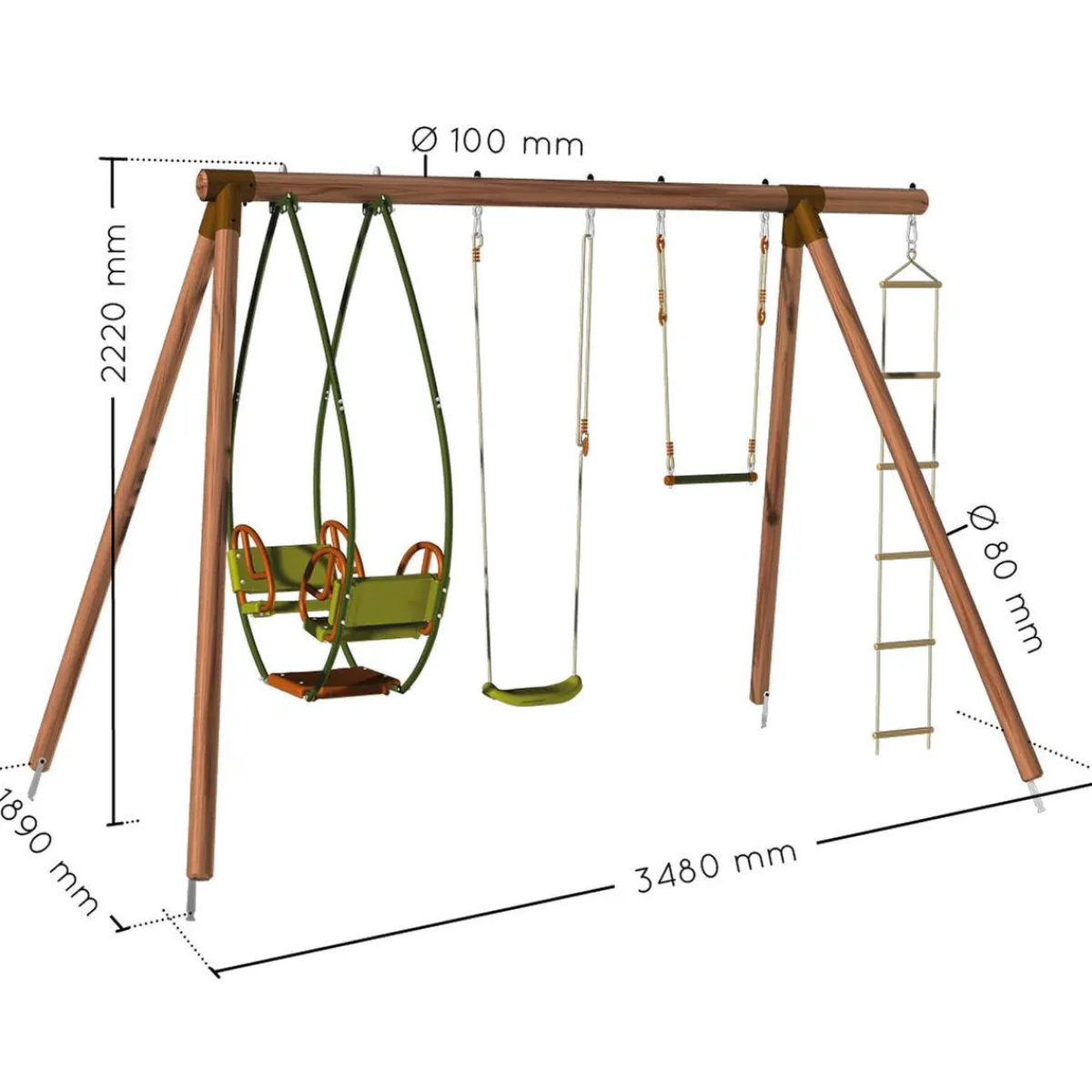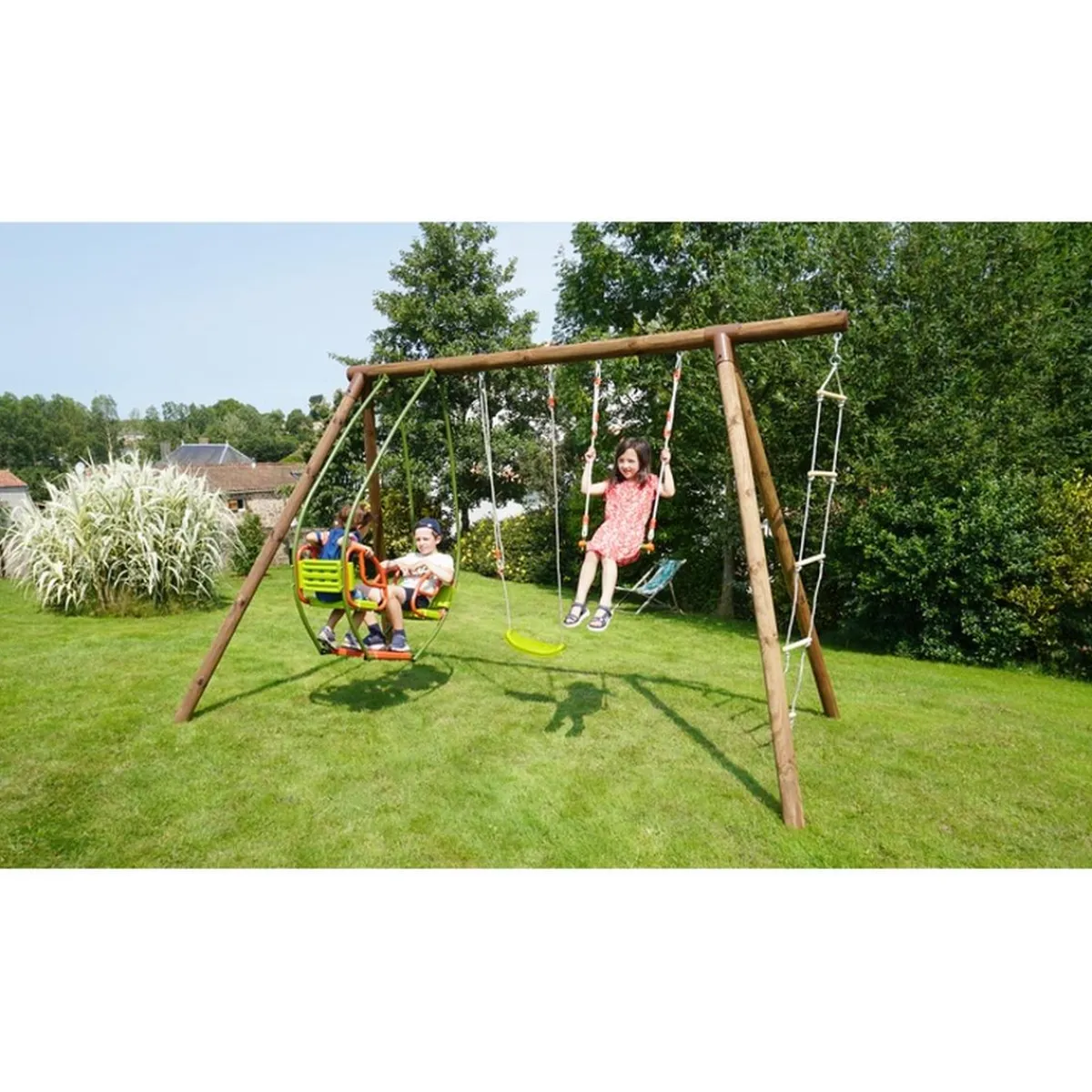 Incluye anclajes para el suelo, 1 balancín doble, 1 asiento individual, 1 trapecio, 1 escalera de cuerda con protección antipellizcos y anillas reforzadas.