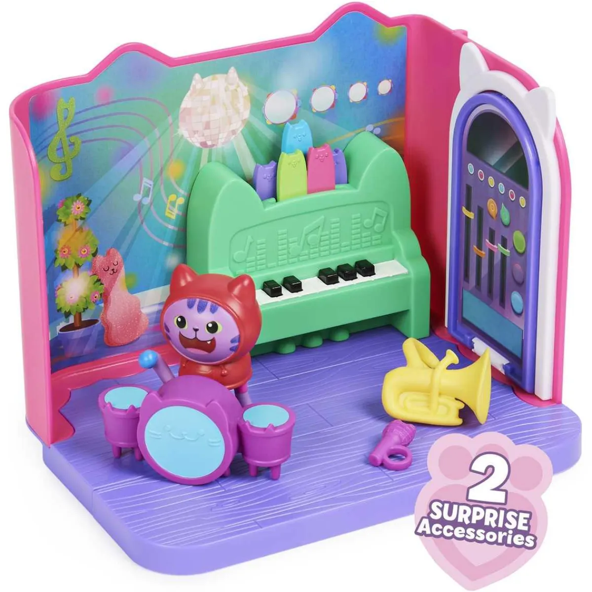La Sala de Música viene con una linda figura coleccionable de DJ Catnip, lista para animar la fiesta. Además, encontrarán dos accesorios sorpresa: un micrófono y una tuba que DJ Catnip puede sostener o llevar puestos de verdad, lo que permite a los niños dar rienda suelta a su imaginación.