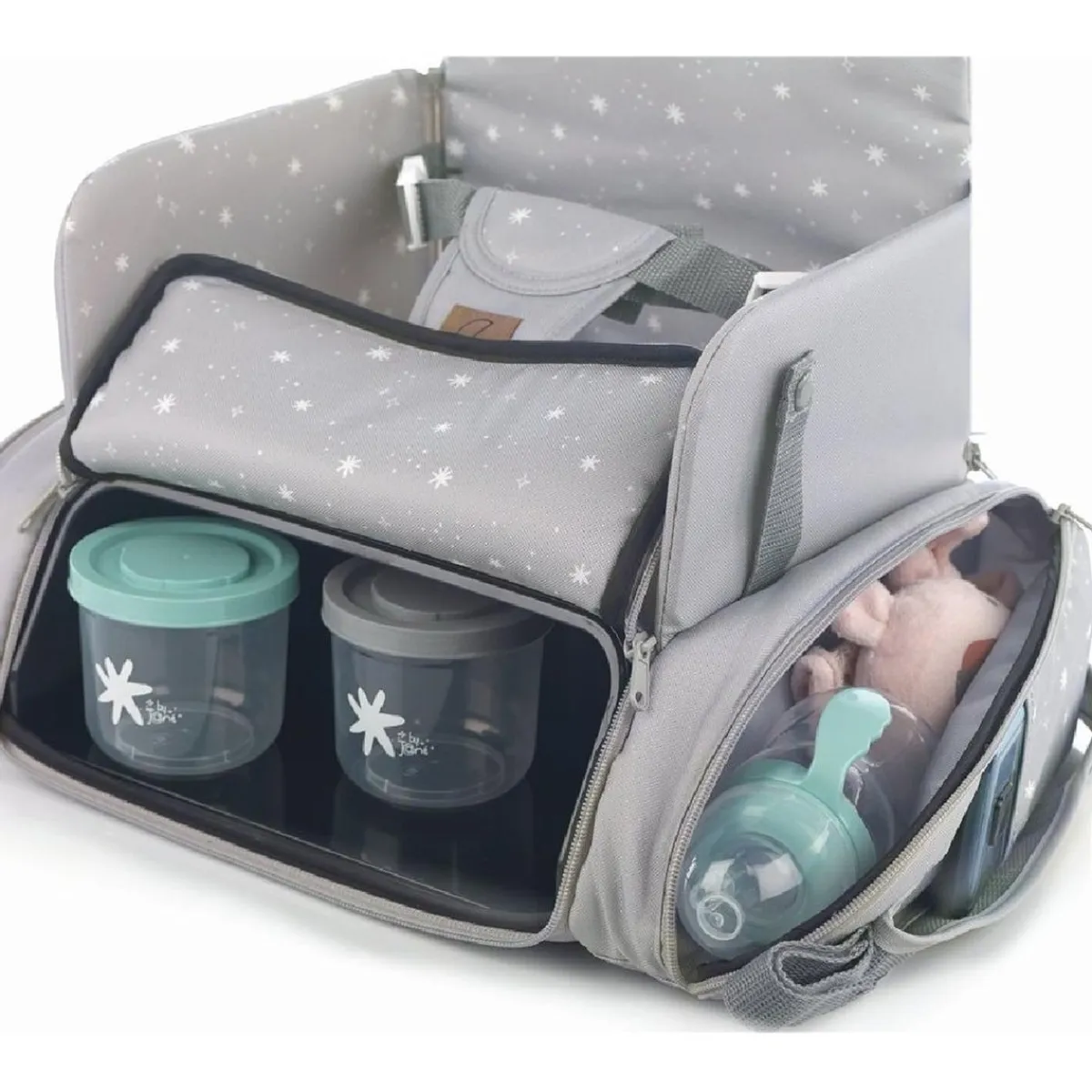 - Materiales de alta calidad: Fabricado con tejidos duraderos y antimanchas, el bolso trona es resistente y fácil de limpiar, ideal para el uso diario.