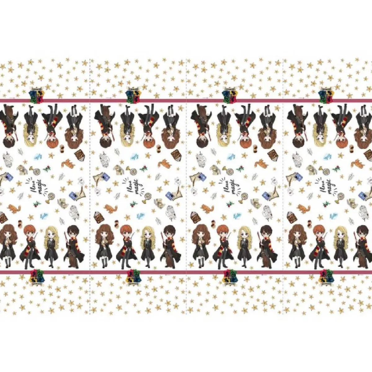 El mantel está estampado con Hermione, Ron, Harry y Luna, además de un montón de objetos de la saga que cualquier seguidor de la magia reconocerá.