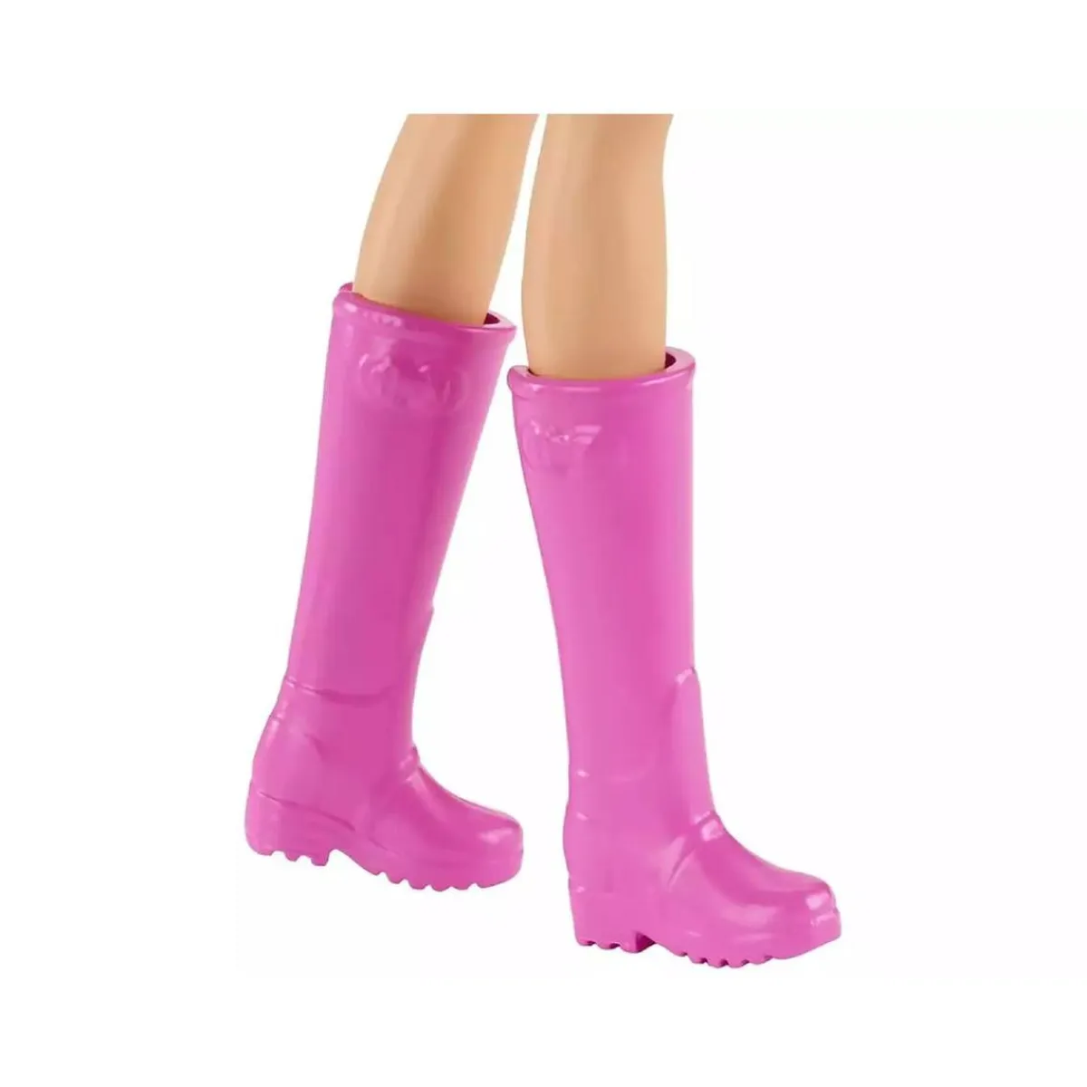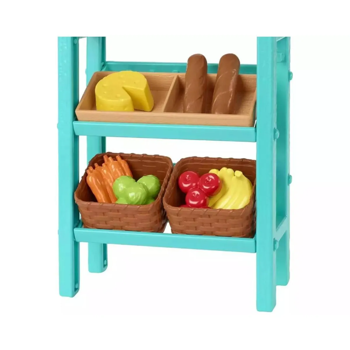 La muñeca Barbie lleva un adorable vestido con estampado a cuadros vichy, un delantal de flores y botas rosas altas, lista para atender a sus clientes. El puesto del mercado tiene un toldo con estampado a cuadros vichy y estantes con dos cestas para poner las frutas, las verduras, el queso y el pan. También hay flores expuestas en un recipiente para quien quiera comprarlas. La muñeca Barbie puede pesar los productos agrícolas en la báscula, que tiene un indicador que se mueve, meterlos en la bolsa para dárselos a sus clientes y marcar el precio en la caja registradora.