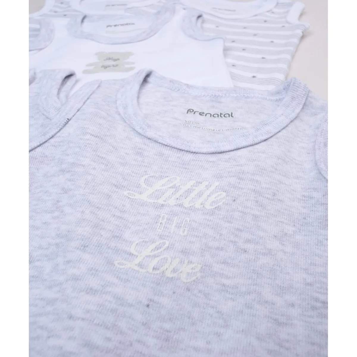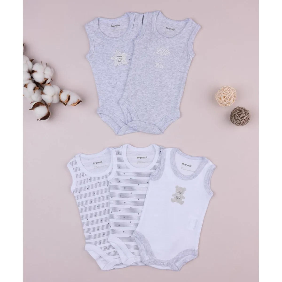 Este práctico pack de bodies sin mangas consta de cinco piezas: dos bodies en gris claro jaspeado y tres en blanco. Todos están decorados con pequeños estampados que añaden un toque encantador.