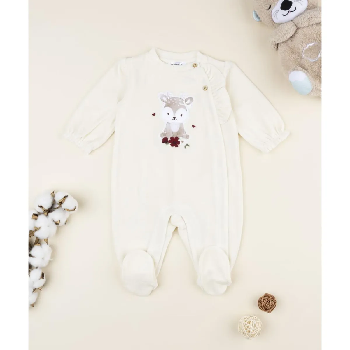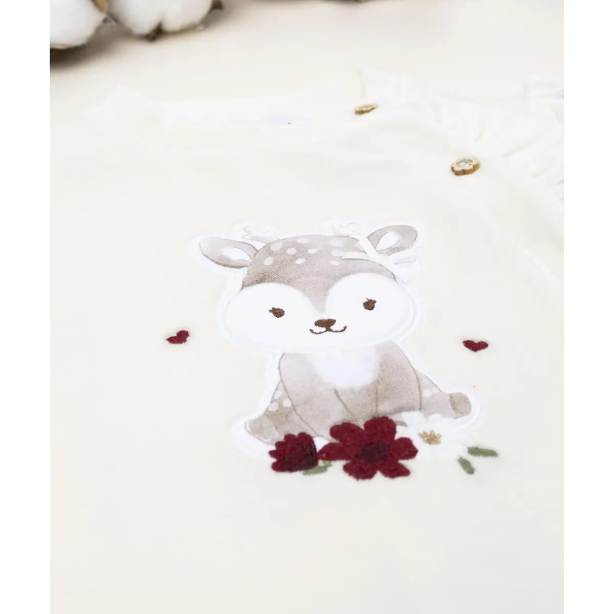 Este pelele con pies en tono crema viste a la bebé con dulzura y confort. La prenda, de terciopelo de algodón, luce una tierna ciervita estampada y una práctica apertura frontal en diagonal con automáticos adornados con pequeñas flores, además de corchetes en la entrepierna para agilizar el cambio de pañal. Las babuchas integradas mantienen el pie calentito evitando calcetines sueltos.