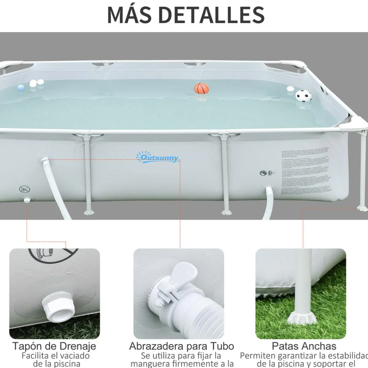 Medidas 252 x 152 x 65 cm. Capacidad máxima 2.163 l. Requiere montaje. Color gris. Longitud de los tubos de la depuradora 1 m. Cable de alimentación 2,2 m. Depuradora de filtro 1200 l/h.