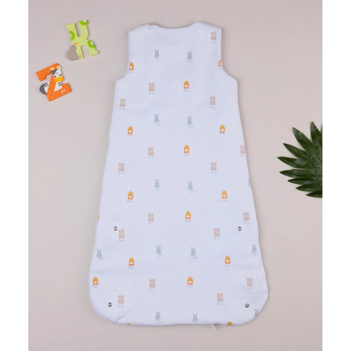 Saco de dormir cálido unisex. La prenda se desarrolla sobre una base blanca con estampado de dibujitos en tonos suaves. Presenta botones automáticos que permiten un uso práctico. Accesorios no a la venta. El paquete contiene solo la prenda de vestir